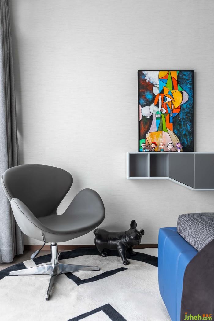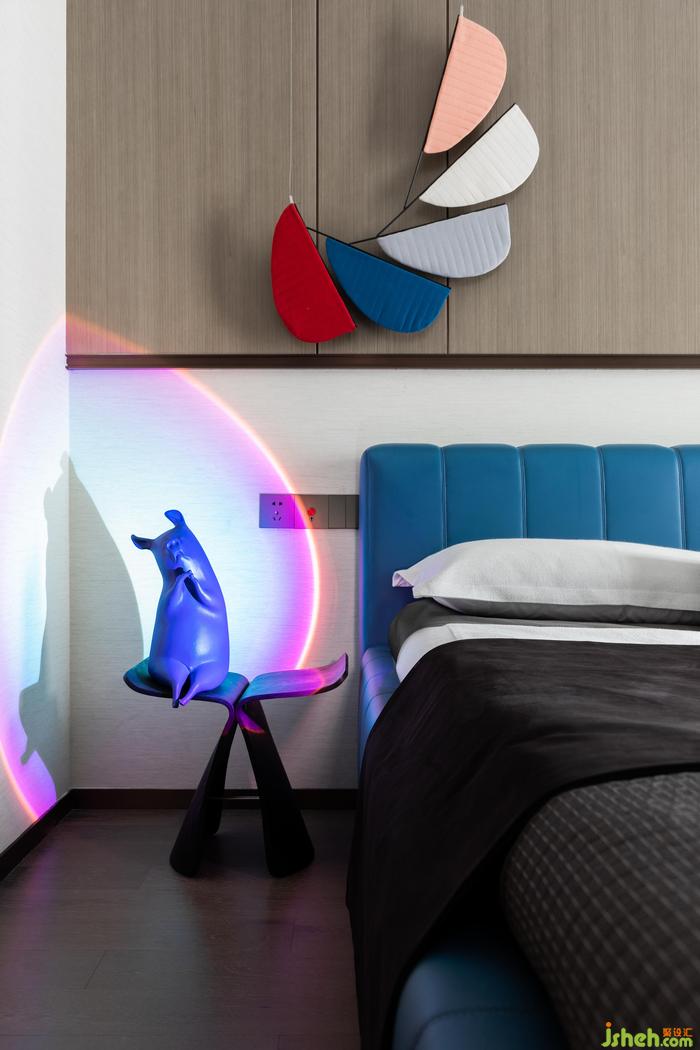 起居空间丨墙壁的创意装置,床头的创意灯具,每一处都在彰显居者艺术的气息;落地的光影为这一隅属于热爱的空间,呈现着可以治愈心灵的安全感和满足感,方正通透的格局,也使得居者对生活的真诚与热爱,被演绎的淋漓尽致,无需繁复的铺陈,自有格局的角度.