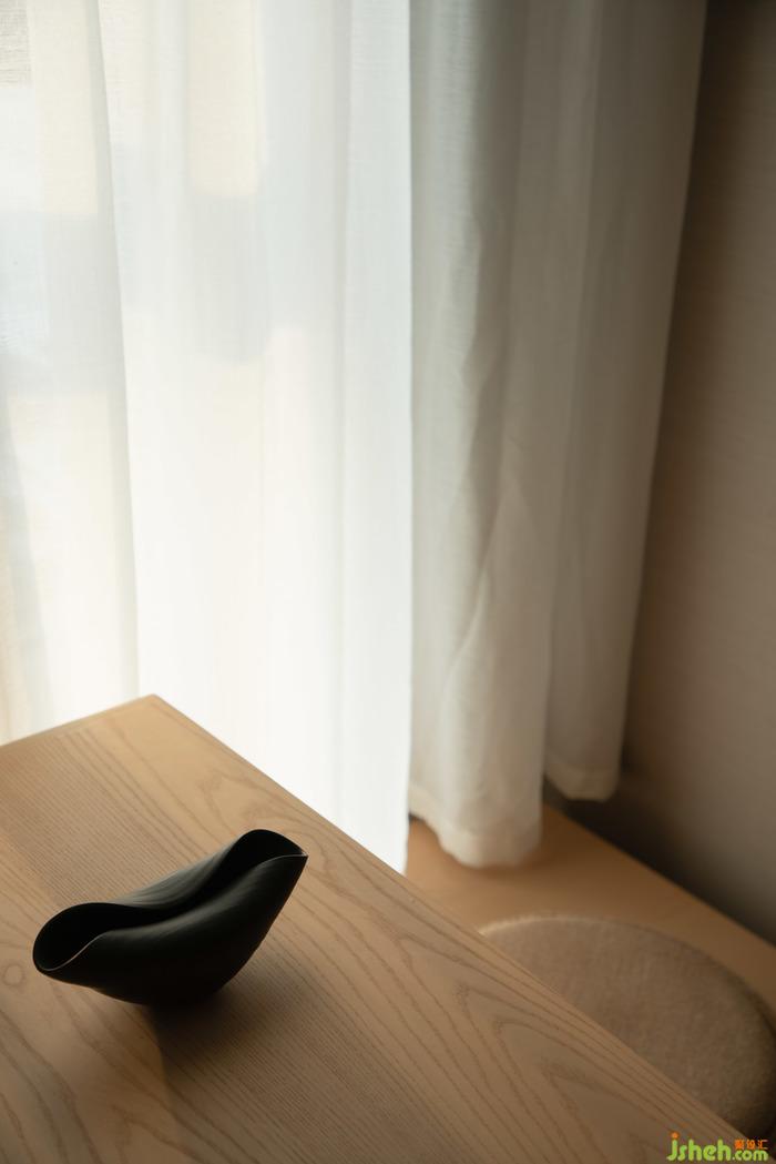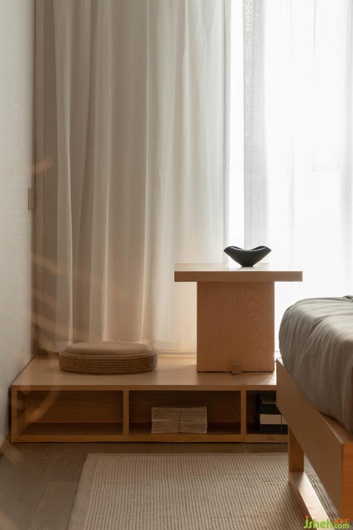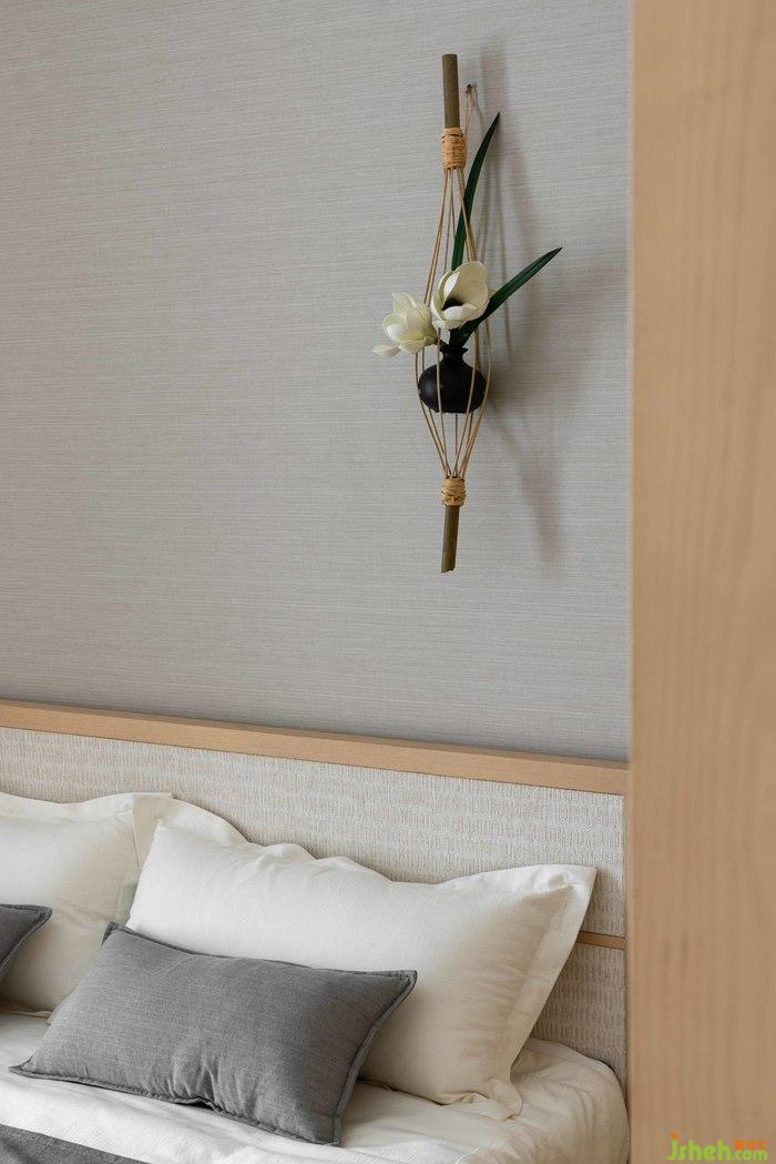 主卧丨优雅的原木气息与素雅的色调墙面相碰撞,节奏性的空间排序,体现出解构主义的秩序感,一盏阅读小灯,一枝墙壁花蔓,都铺陈着雅静的格调,而落地的飘窗之下是优雅的小憩区间,看一本书、品一盏茶,都是意趣的极致体验