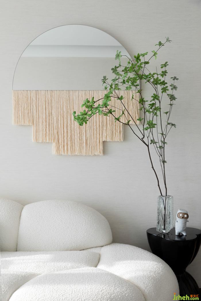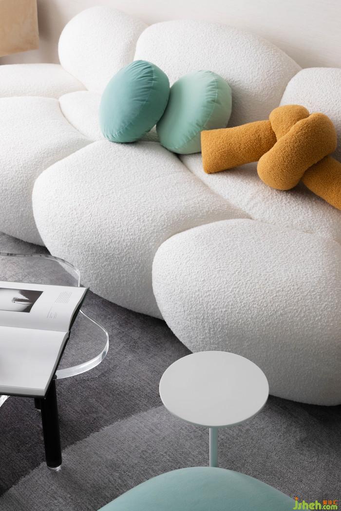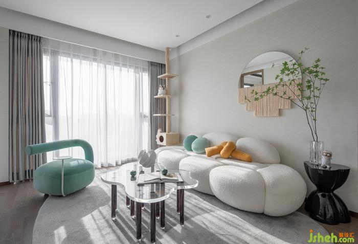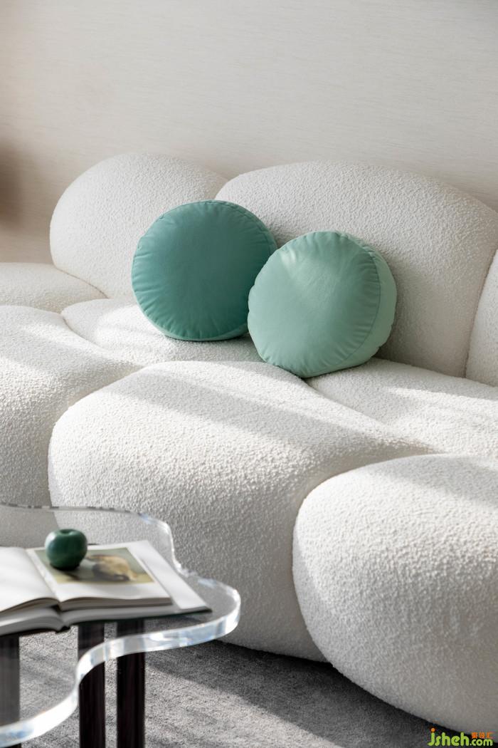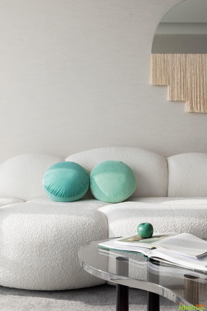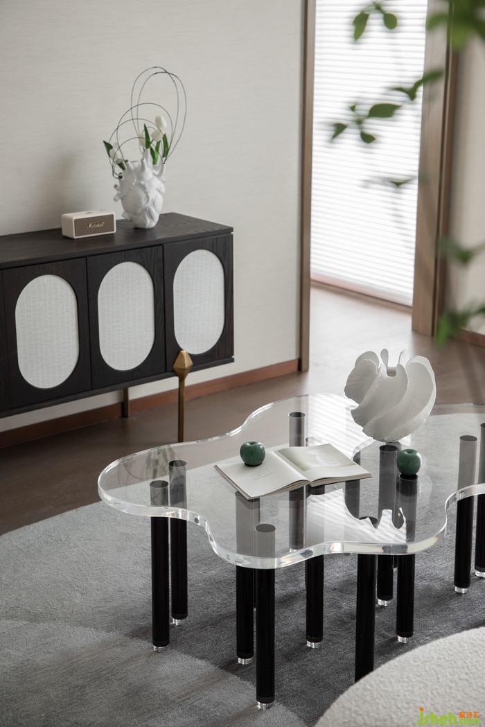 客厅丨异型的毛料沙发,亚克力桌几的不规则写意配比,通过富有动感的线性褶皱增强了半透明效果,给视野无尽的柔和与创意,让客厅的互动空间充分响应了来自生活的治愈,即使漫游其中,既可以通过不同的视角,感受空间的畅意
