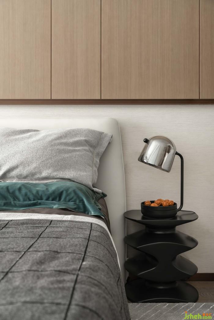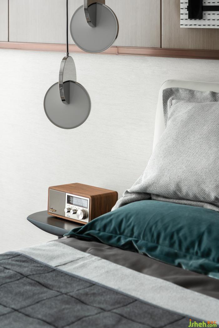 卧室丨落地窗的通透视野搭配着色调素雅的起居空间,让创意十足的元素配饰与床头摆件产生关联,在相同元素的串联下,属于起居的故事即刻便开始书写,样板房设计有居者睡前阅读的延伸,也有居者聆听音律的热爱,生活就是随性的细节转换。