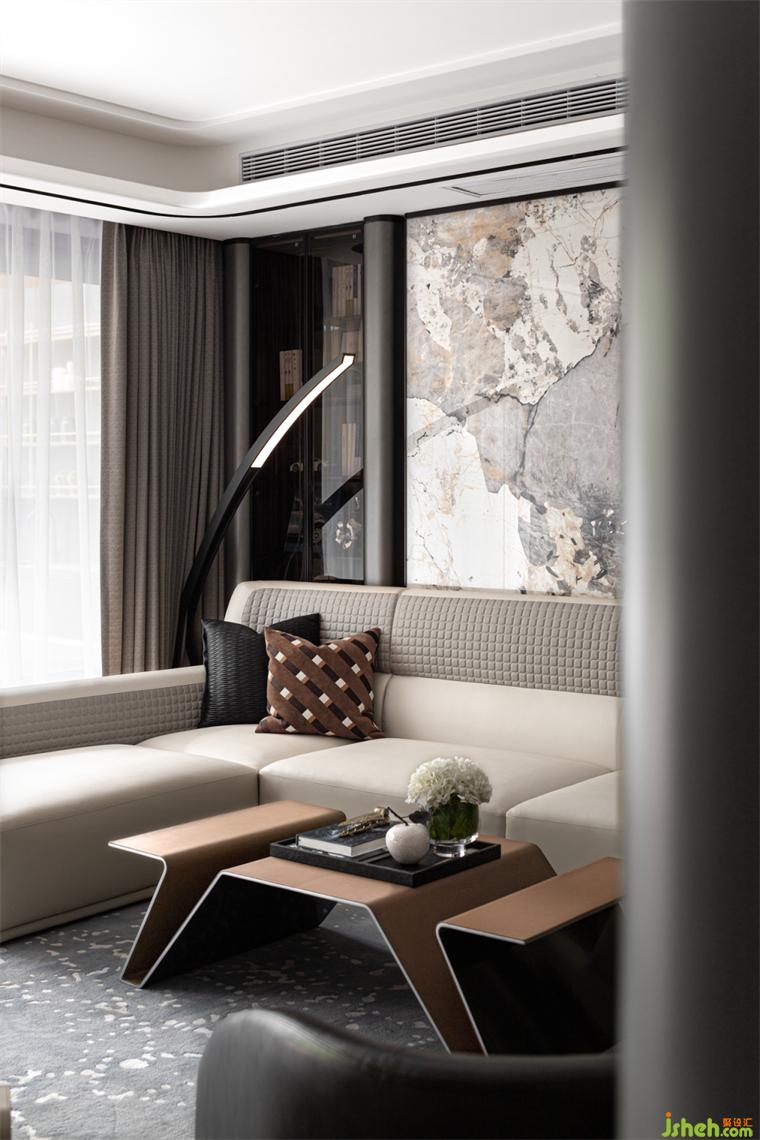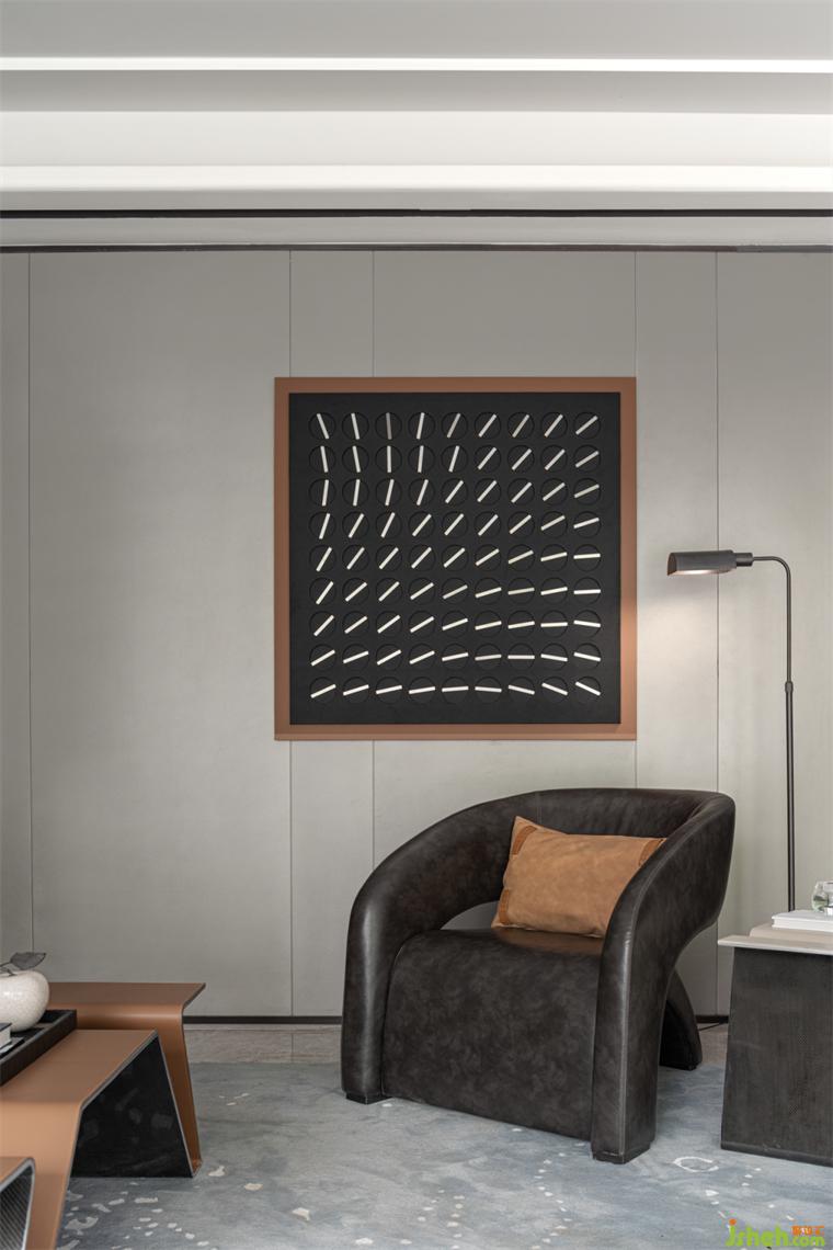 客厅丨高级的灰调与橙色相遇,冷静与热情碰撞,低调与张扬对接,样板房设计积蓄的力量刹那迸发惊爆了感官,空间的开合,色彩的解构,简洁的线条,别致的家具组合,在不同的状态和光线下充满不同的趣味与变化。