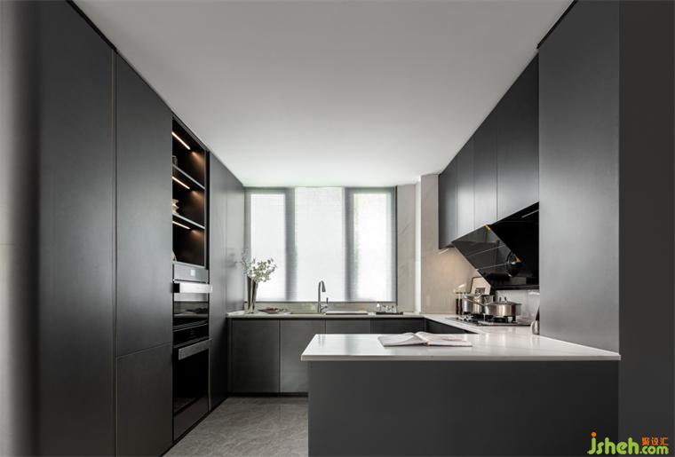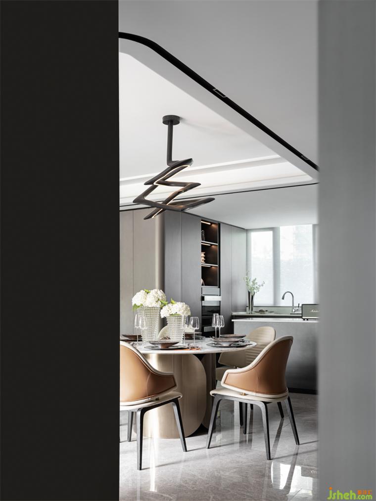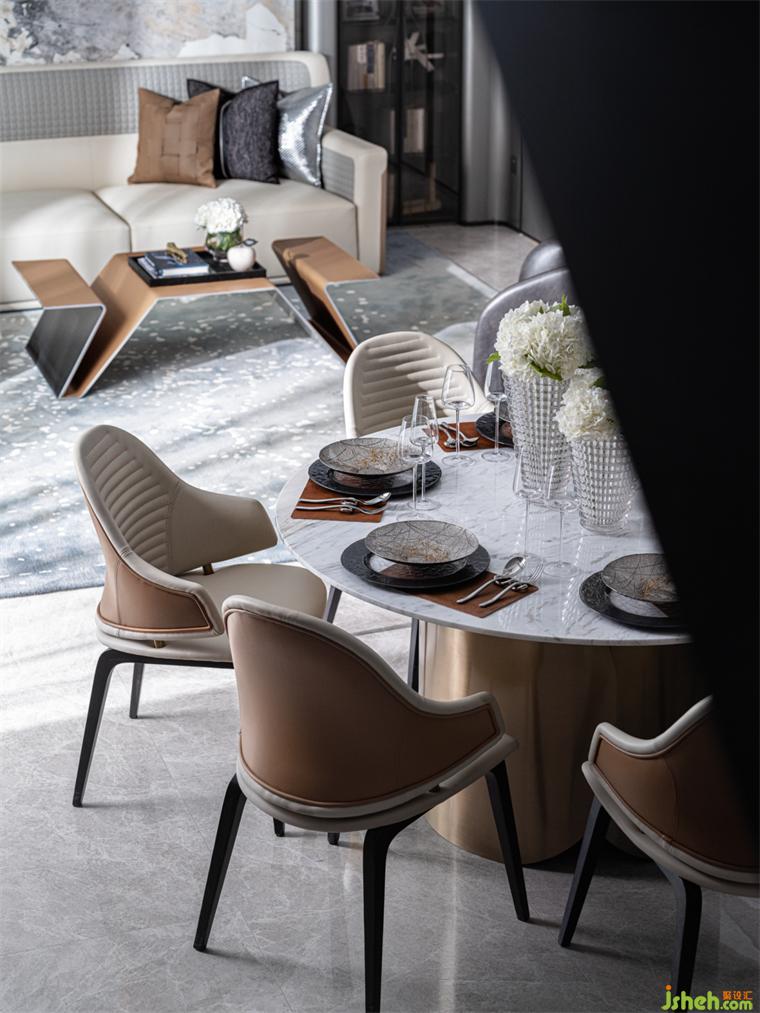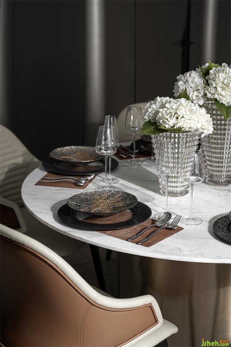 餐厅丨U型半开放式的厨房将餐厨岛台融合到设计里,极大地利用空间,样板房设计圆形餐桌能容纳多人围坐餐食,聚拢人气,给予浓烈的生活气息;精致的餐具组合增添空间的质感,在品味餐食的同时也在品味美好生活。