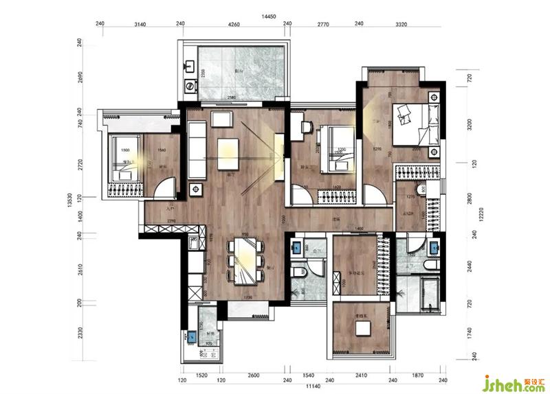 2、结构方面,厨房面积不大,占用了餐厅面积,餐厅相对说比较小,所以我们把生活阳台取消,并入厨房,面积不大相当于是中厨,所以冰箱和高柜也放出来了,和餐厅一个整体,这样餐厅显得大很多。