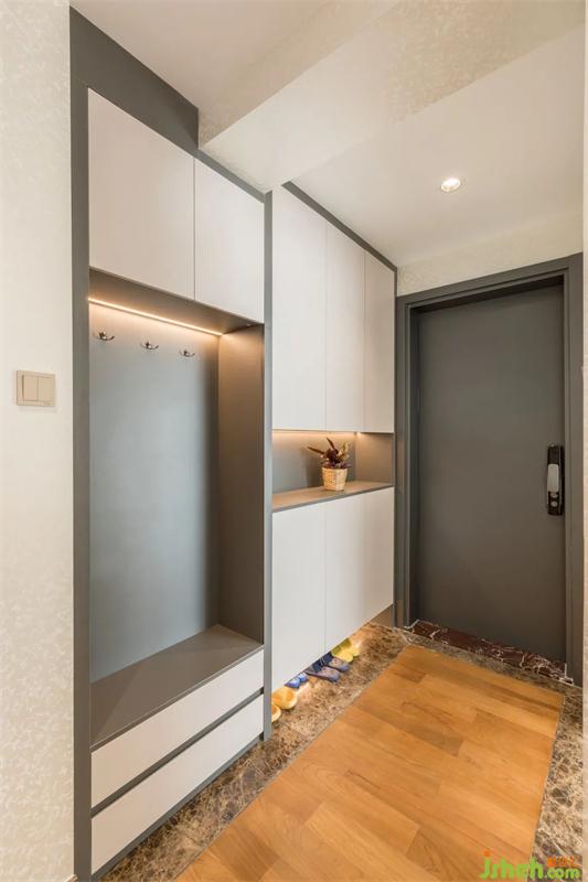 玄关尽可能多的量体储藏,以三分露七分藏的原则、以不对称的手法、以黑白灰木的配色,满足更多生活需求、重塑新的动线关系。