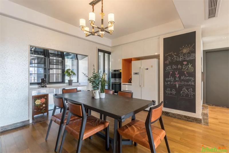 移步餐厅,墙面搭配大面积的黑板,随手小记,冰箱贴画,使空间更具温馨感。