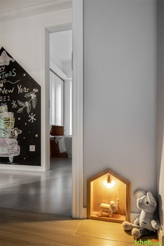 作为孩子的专属活动空间,儿童房不是一个空间,更是一段独一无二的时光,是承载着整个童年回忆的地方,门边的屋子脚灯守护着孩子的童趣。