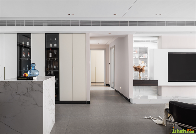 酒柜镶嵌于整块墙壁之中,在无风无雨的日子里,约上三两好友,共同品鉴红酒,摇曳的灯光与甘醇的酒香是高品质生活的显露。