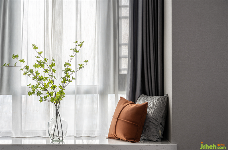 窗台的处理兼顾了晾晒和阅读的功能性。墙面铺贴饰面板与墙布,宽窄相间的比例线条让空间有律动的节奏感。