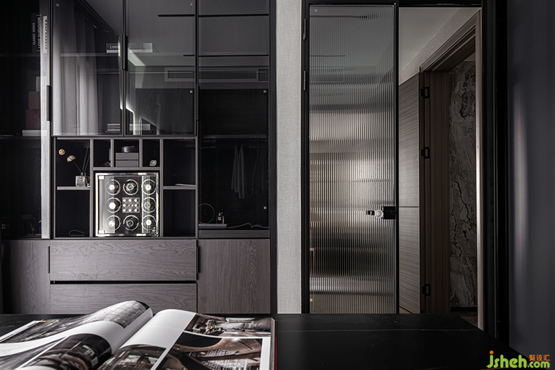 利用隔板和抽屉搭建合理的展示柜,业主生活中爱好的物品在空间中被谨慎地呈现出来,机械表,邮票等。