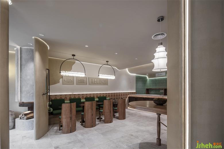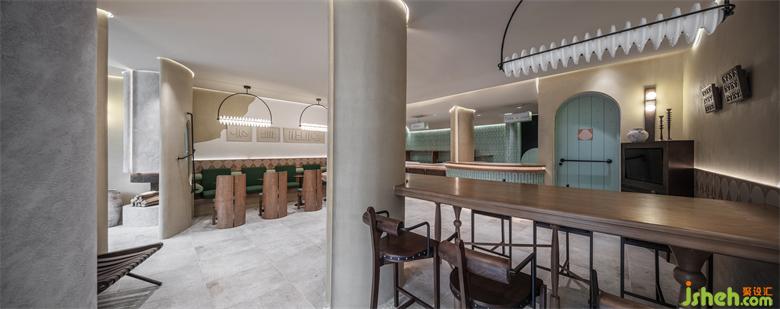 荒漠绿洲最难觅,转角茉香更沁人。入口处没有扑面而来的葱葱郁郁,反而将微水泥的原始质感延伸到室内,餐厅设计粗粝的墙面既像是工业文明遗迹,又像古老的羊皮卷,将室内外的设计铺陈协调一体,打造端景的同时,又与原木装饰呼应,营造出斑驳的荒芜感。