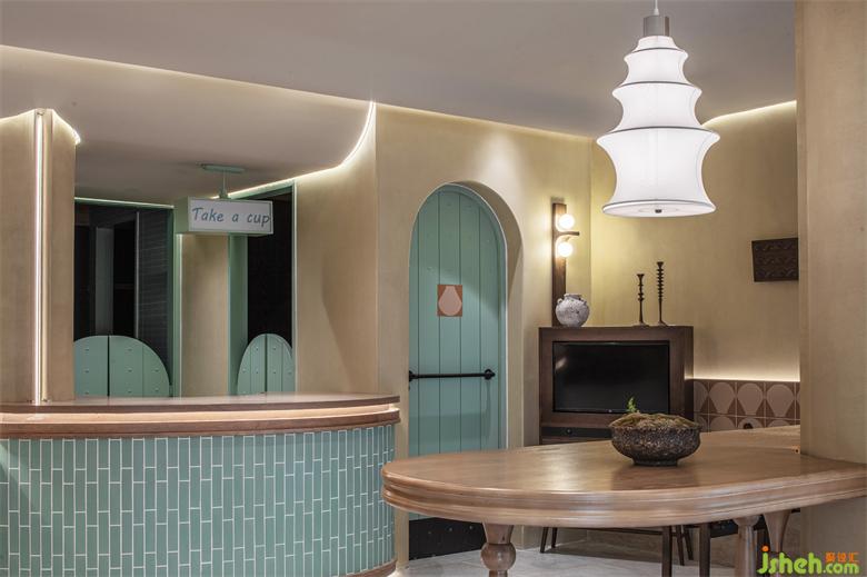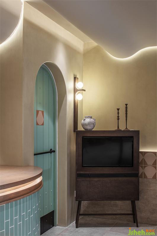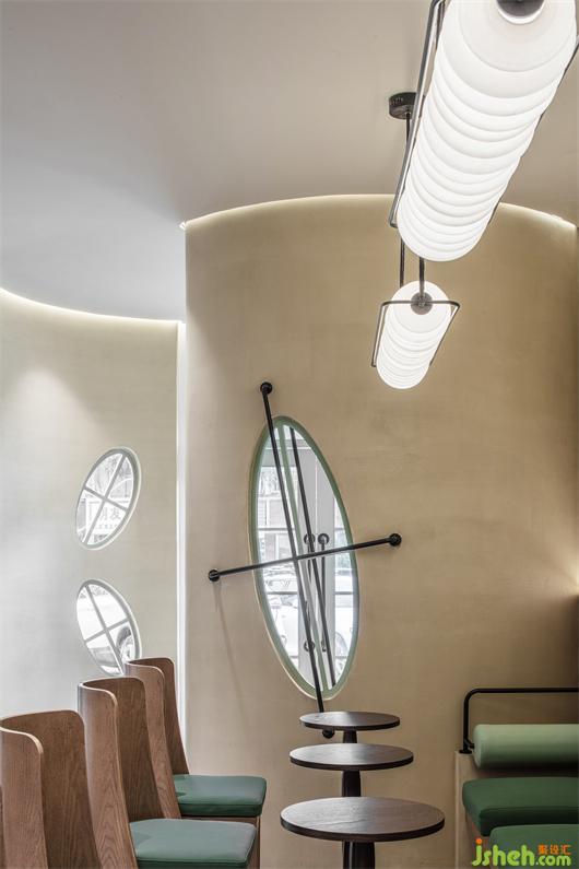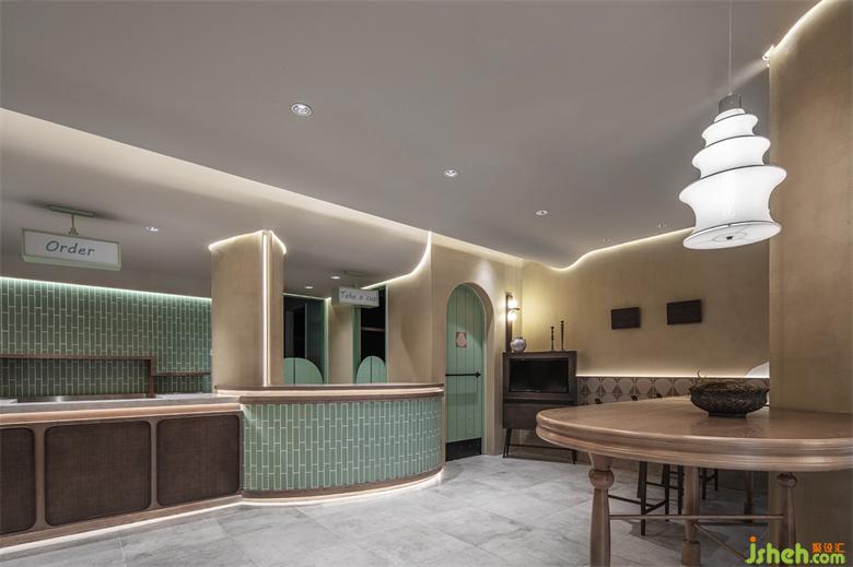 经营区的柜台及墙面以强烈的建筑感与序列感打破沉闷,共同承载起情感氛围的营造。餐厅设计多种元素的衔接调和,在色彩与几何元素的融汇碰撞中,构筑利落清爽格调,又极具时尚气息。拱形门与圆弧围栏的组合正像水分丰沛的沙漠植物,有秩的线性肌理搭配浅绿色的通篇布局,于盎然生机中呈现出虚实交替的美学意境。