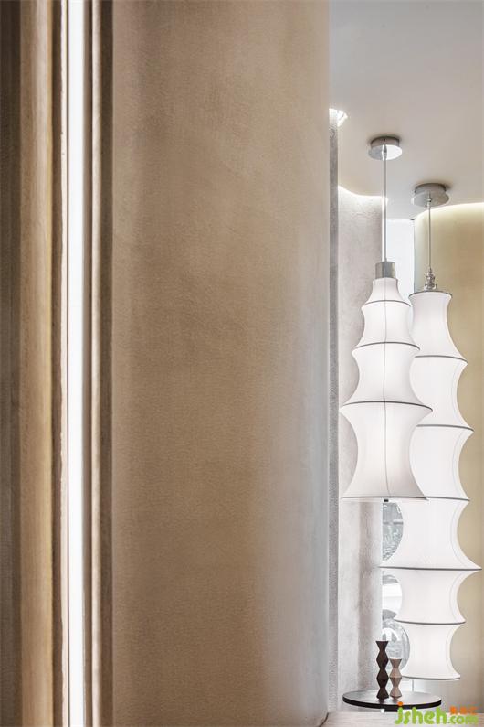 不同造型和材质的桌椅有序分布,通过座椅高度的变化,实现几何关系高低错落的穿插,增加空间的层次感。纵向的几何形吊灯拉近了人与空间的关系,在不同的光源聚焦点均可获得沉浸式体验,使消费者在享用茶饮的同时,能享受片刻独处的悠然时光。
