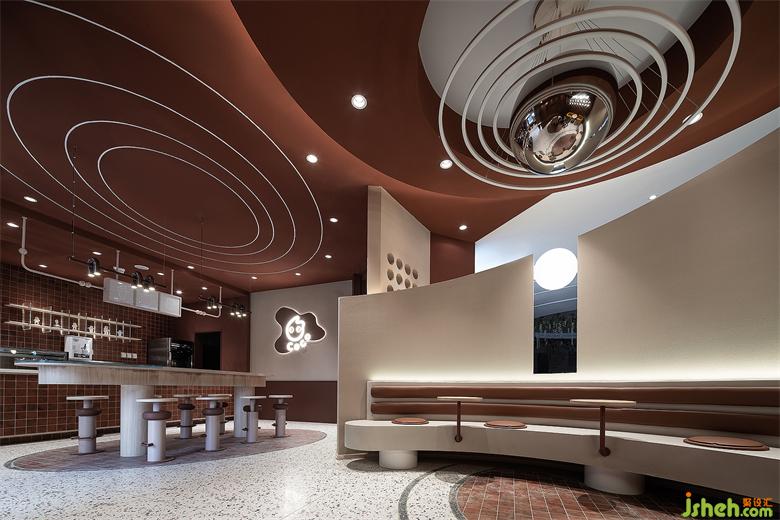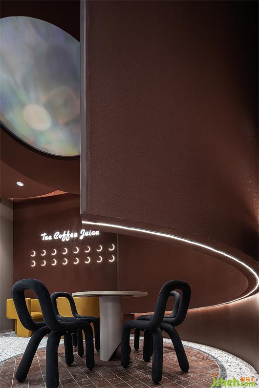门头造型呼应飞船着陆的概念,奶茶店设计运用自然与物象的肌理,组合成新的趣味性视觉语言。外墙面刷成焦糖色,宛如高原上的“红土壤”,有着来自原始的包容性。大小不一的球形灯散落在粗粝且质朴的陨石壁上,营造出强烈的视觉冲击感,引导来往的行人去探寻、发现和感知。
