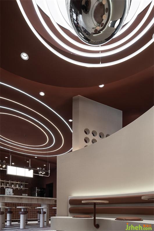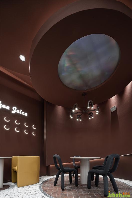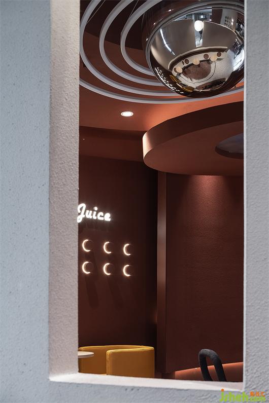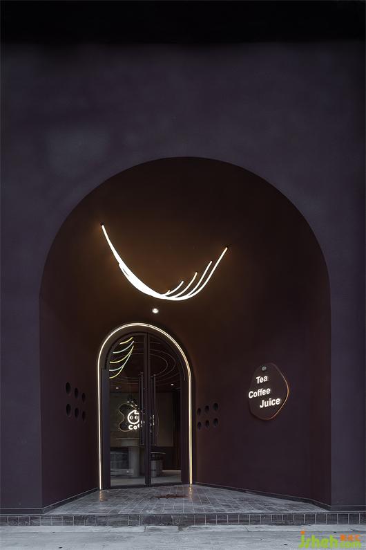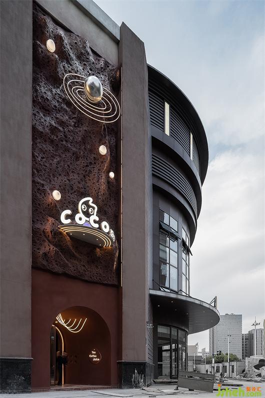 The front door shape echoes the concept of spaceship landing and combines the texture of nature and objects into a new interesting visual language. The outer wall is painted with burnt sugar color, just like the "red soil" on the plateau, with the original inclusiveness. Spherical lights of different sizes are scattered on the rough and simple meteorite walls, creating a strong sense of visual impact, guiding pedestrians to explore, discover and perceive.