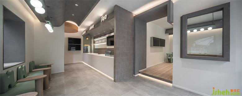 推门而入,室内沿袭了外观的简约与内敛,以奶茶色和高级灰为主调,辅以原木、浅绿,奶茶店设计为空间注入清新、自然的意蕴,奠定一种温馨、治愈的社交氛围。设计师运用现代建筑思维方式,从曲线与直线的组合中,撷取并延伸出有规律的形体来构筑空间关系,打造通透开阔、层次分明的餐饮环境。
