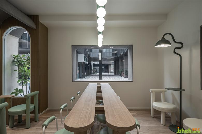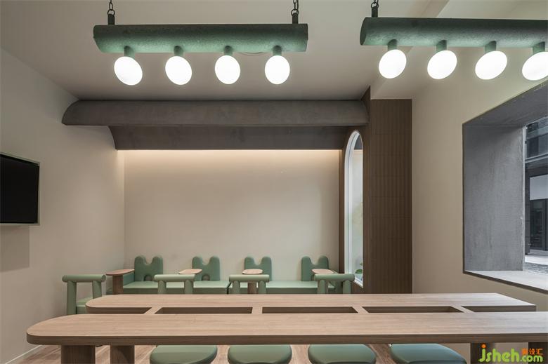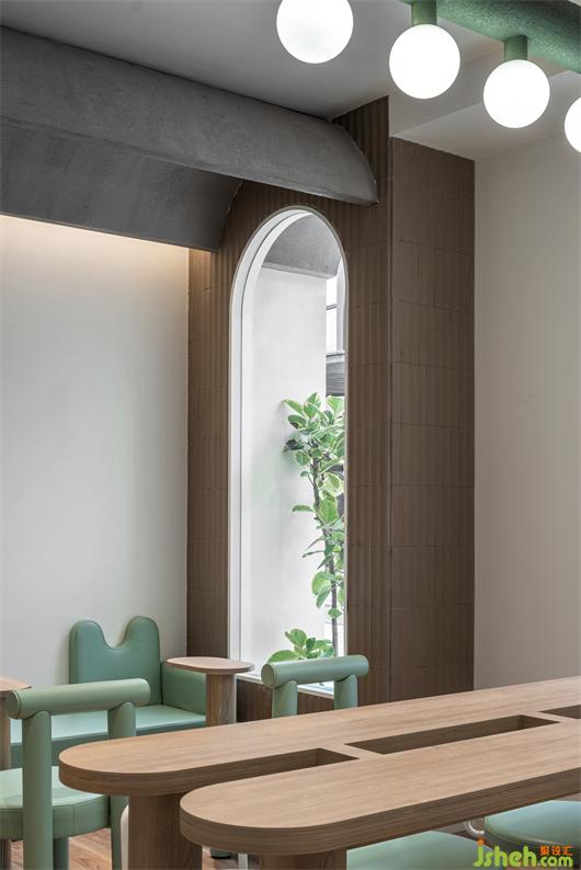 桌椅家具摒弃了尖锐的棱角,多以圆润柔和的线条示人,灵动且充满张力,颇具几分大象无形的淡泊之意。木材的肌理与皮革的质感在空间中糅合,流露出极致与低调,奶茶店设计赋予来客一处远离喧嚣、休憩身心的净土。