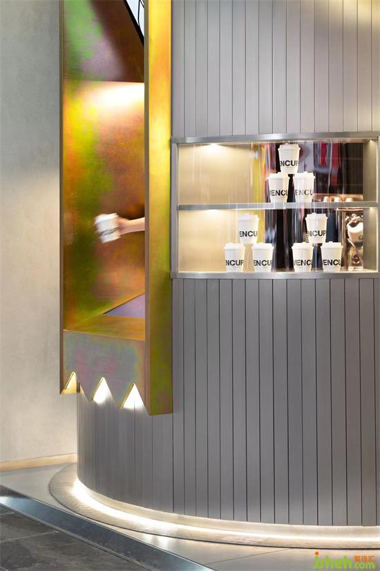 不锈钢表皮的遮掩下,仅有的彩色窗口,让顾客在第一时间无法知晓其内部空间的真实结构,引发更多探索欲望,店铺设计将整个空间的互动锁定在这个窗口,定制化的点单区满足了1V1的服务体验。