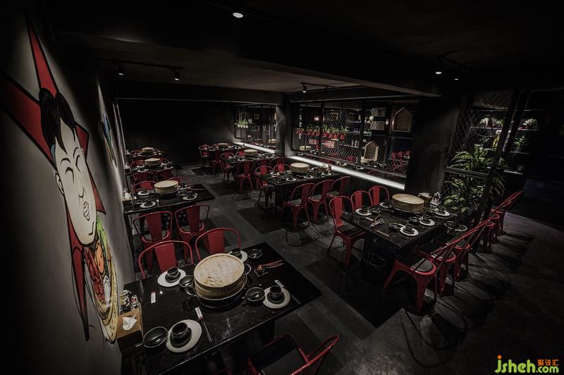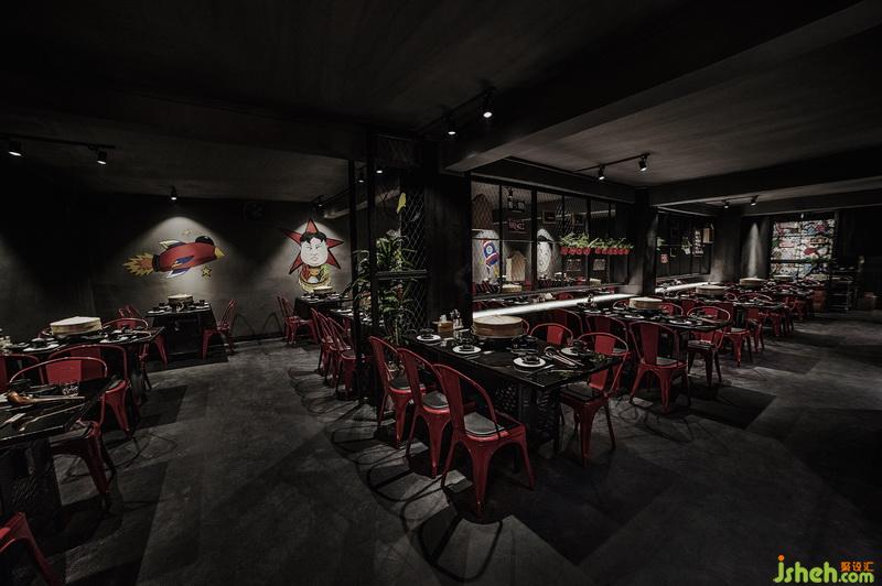 重色调的大环境,不但工业味和酷感十足,还是为了突出餐厅设计软装的精彩。红色和蓝色是朝鲜民族的代表颜色,因此我们在软装设计上选择了大量红色的铁椅子作为空间的焦点。红色具有刺激食欲的作用,红与黑也是既经典又具有视觉冲击力的搭配。独立设计的卡通元素墙绘,呼应主题,颜色丰富,不仅点亮了空间,更令原本的酷感中增添了一份童趣。