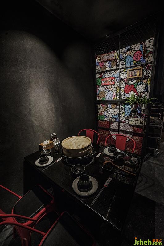 黑色的墙壁,深灰色的天花与地面,如此的重色调能减少灯光的漫反射,使射灯灯光都集中在餐桌、墙绘、墙饰等精彩之处,戏剧化的灯光效果也让人视线更有聚焦的重点。