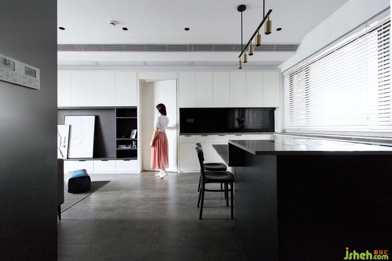 在电视柜与餐厅白色柜体之间,是通往私领域的隐形门。它的存在让客餐厅组合柜更具完整性,视觉延伸的效果让整个空间看上去更宽阔,并且增加了房间的私隐度。