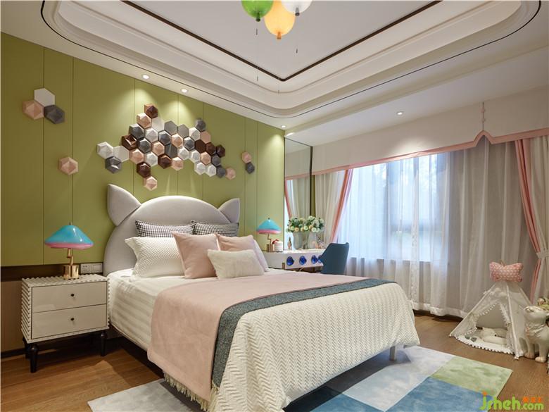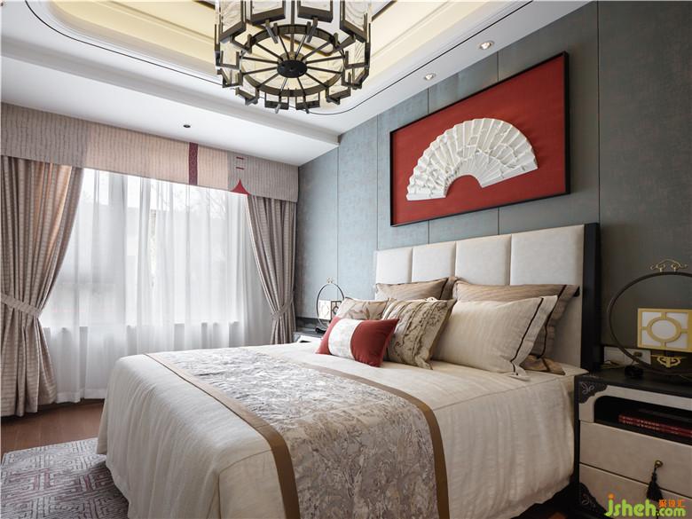 而卧室空间窗帘与床品颜色的互相辉映,突出诗意画境。吊顶加以黑色线条过渡空间层次,