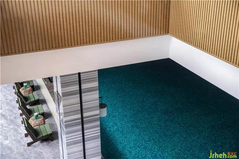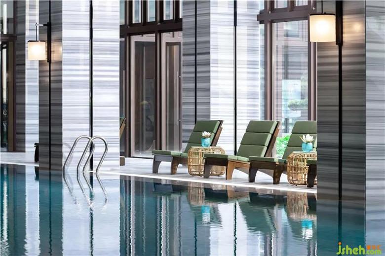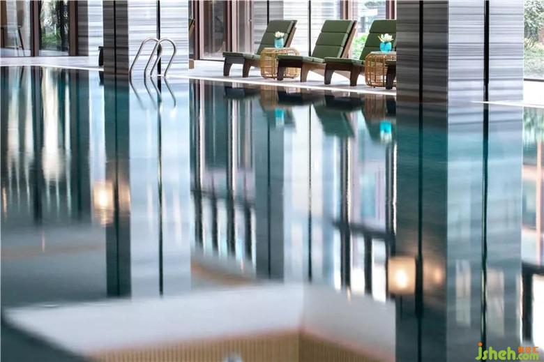 白天从高空凭临,泳池如同一块宝蓝色的宝石,闪缀着熠爚的光芒,而当暮色低垂,池水又摇身一变,成为月牙投映在尘世的梦幻掠影。