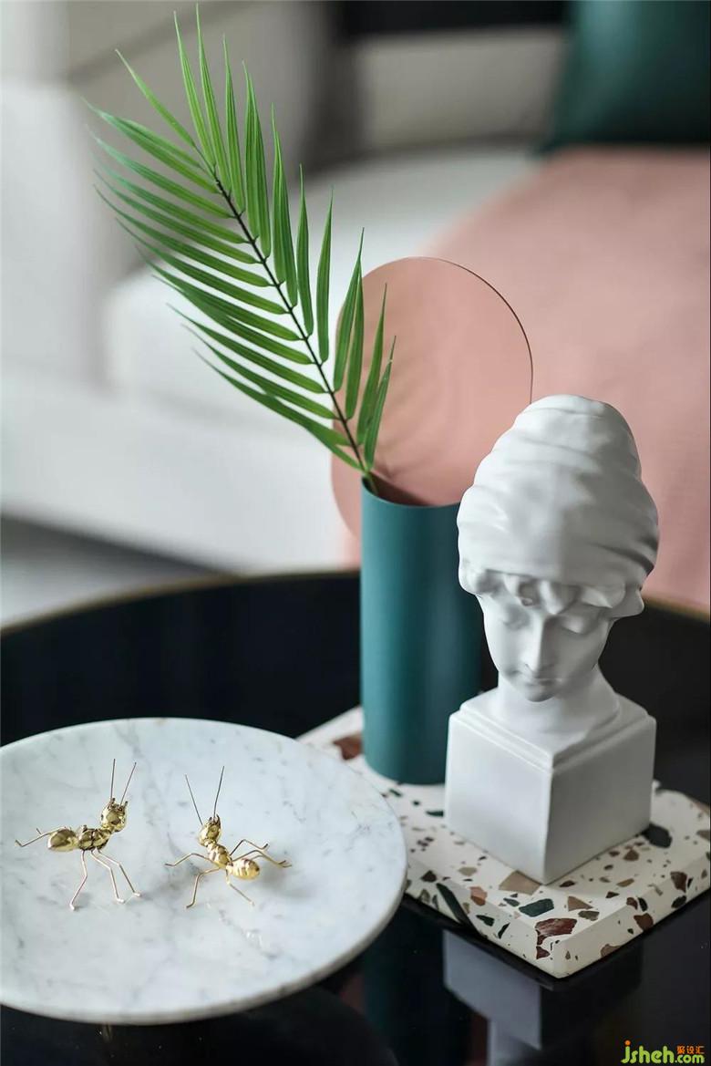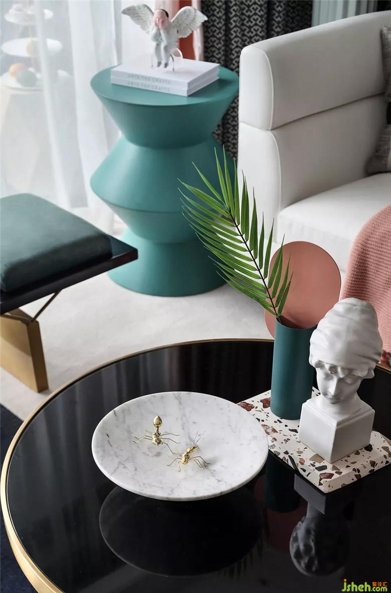 雾蓝色的MAHDAVI置物柜呈现出宝格丽的奢华,经典与时尚兼备;超脱的墨绿、粉蓝点缀在ORNETTE沙发上,恰好平衡空间色彩,散发着活跃、温馨的味道。
