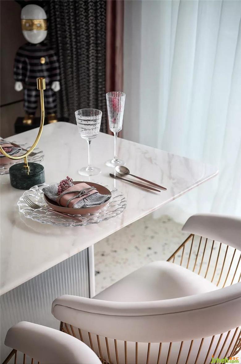 客餐厅的布局拒绝了固有的闭塞,自由畅谈的空间感为居所提供一个包容性强的场所。趣味个性的KOKSAL、PLACE餐桌椅制造出家的异质性,为空间注入一丝生命热力。
