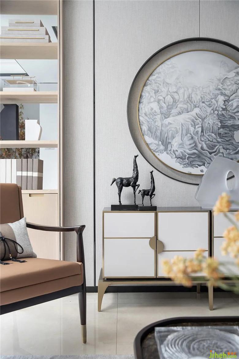 泊于墙上的山水画,与素缟的花瓶、硬朗的雕塑,共同勾勒出丰盈而绵长的一首诗:寸寸微云,丝丝残照。