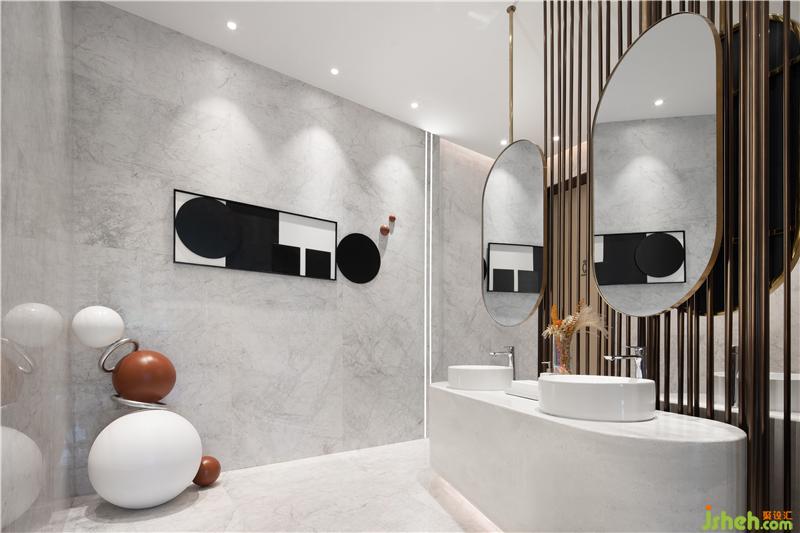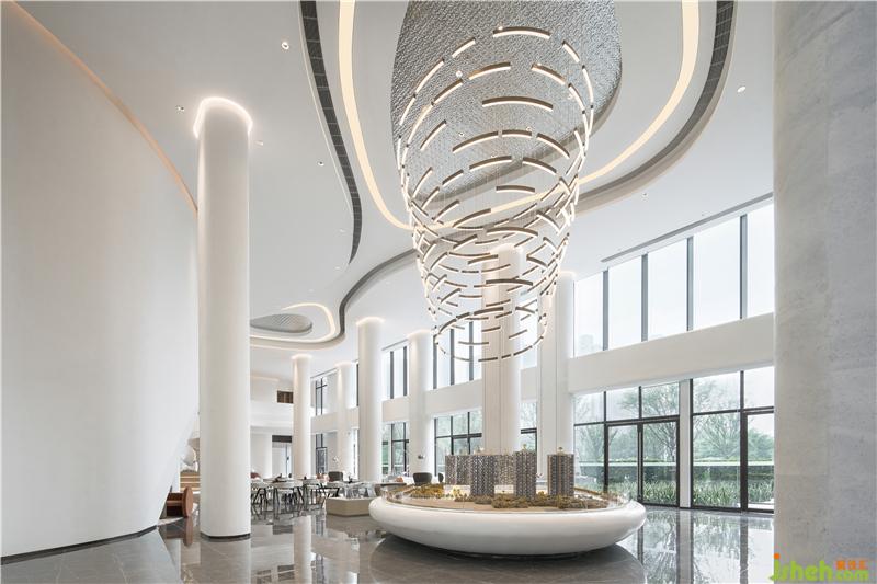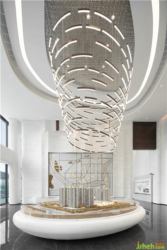 我们将斐波那契曲线转化为楼梯区域的能量点,旋转动态下饱含我们对生活与美的理解。仰面朝上,吊灯与书页在形态的衍生下,售楼处装修设计组成吸附在苍穹之下的空间装置,引领我们从束缚走向自由。