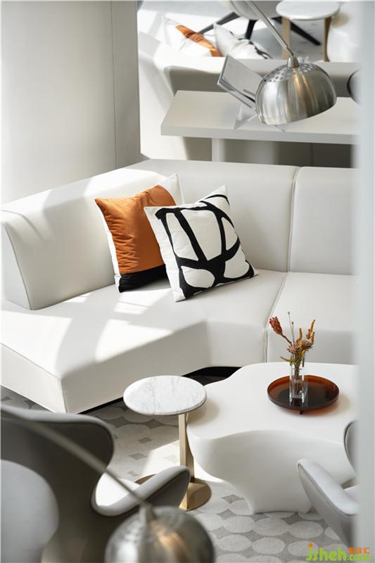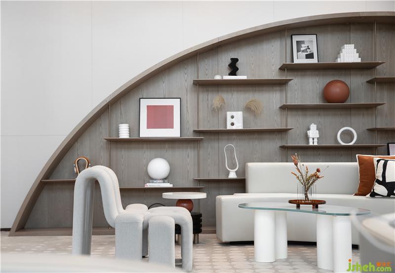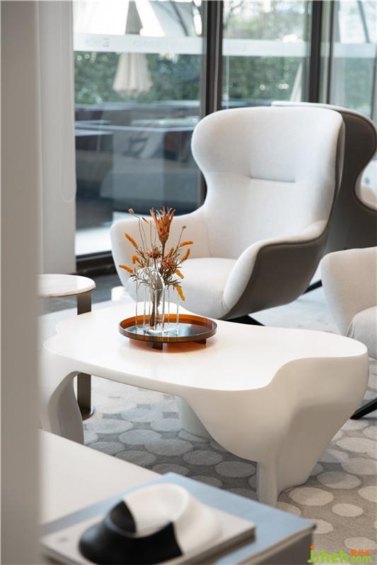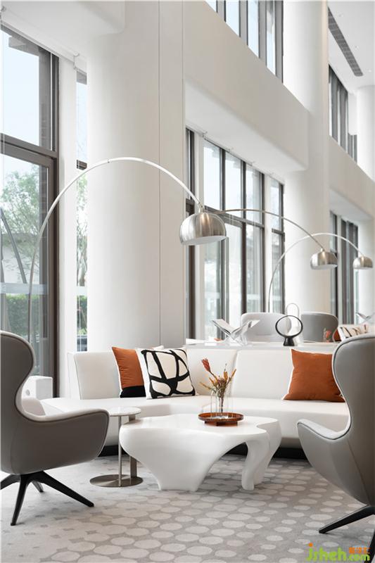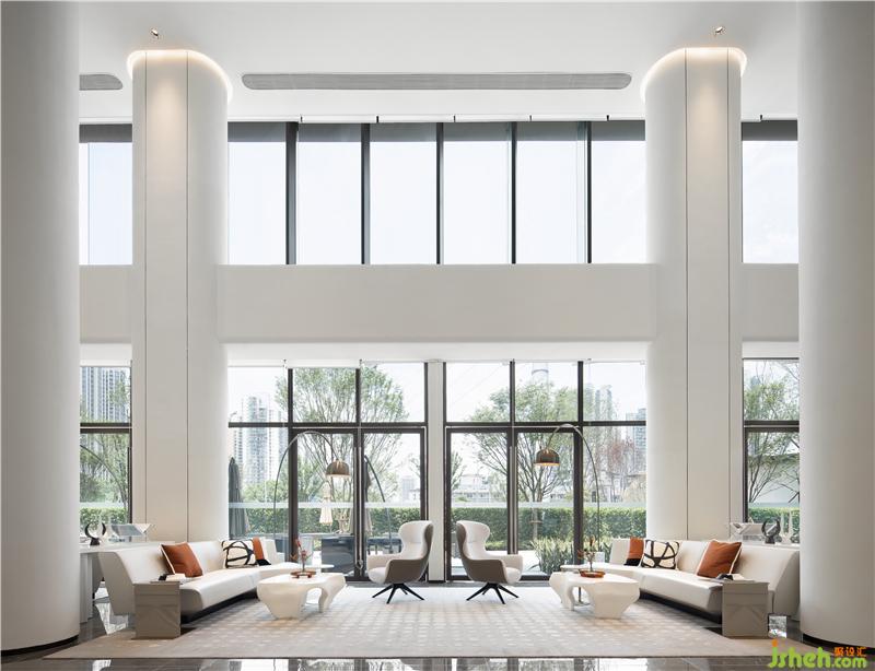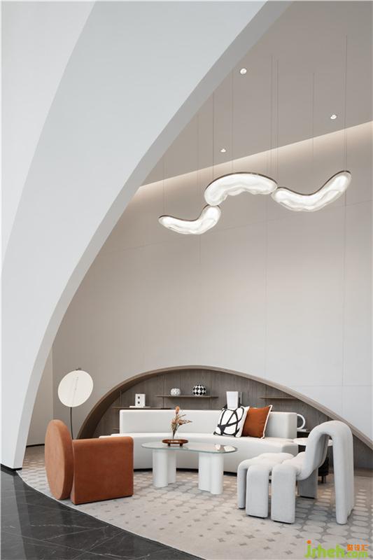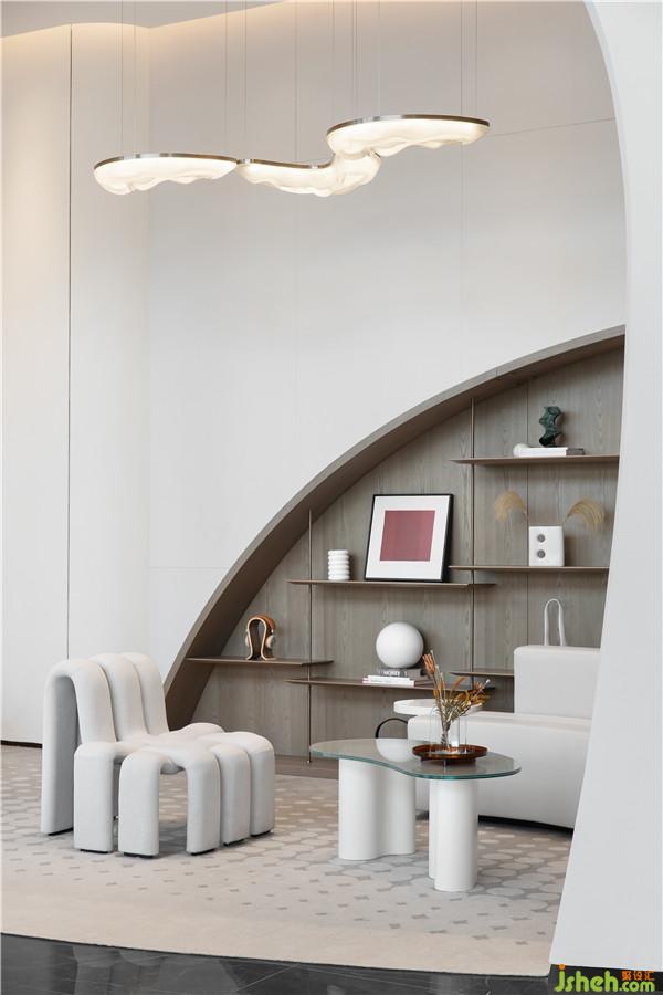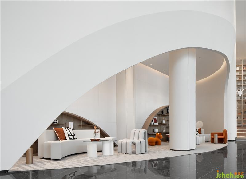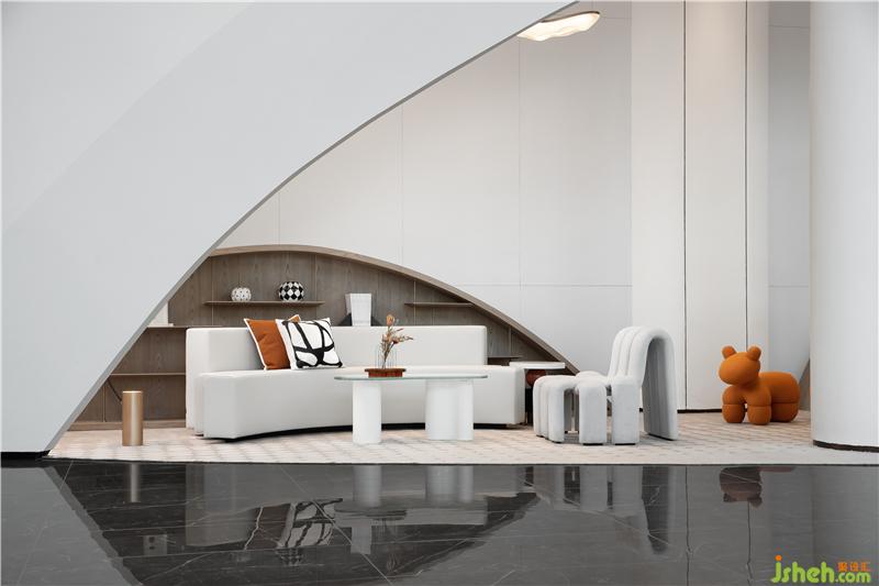步入洽谈区,人们直面的是动线明朗的休闲阅读、洽谈品茗区域。现代简约而精细的美学搭配,随着立柱与弧线曲度流动,形成别具一格的交互体验空间,纯净色彩加以大面积挑空,架梁起繁华都市上的一隅清闲之地,滤尽浮华,内心一派舒朗。