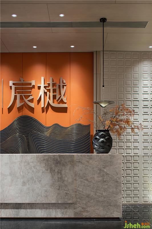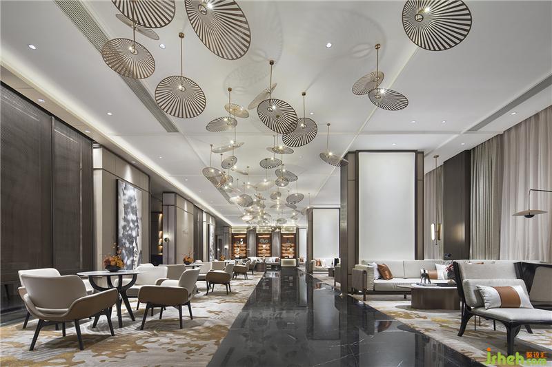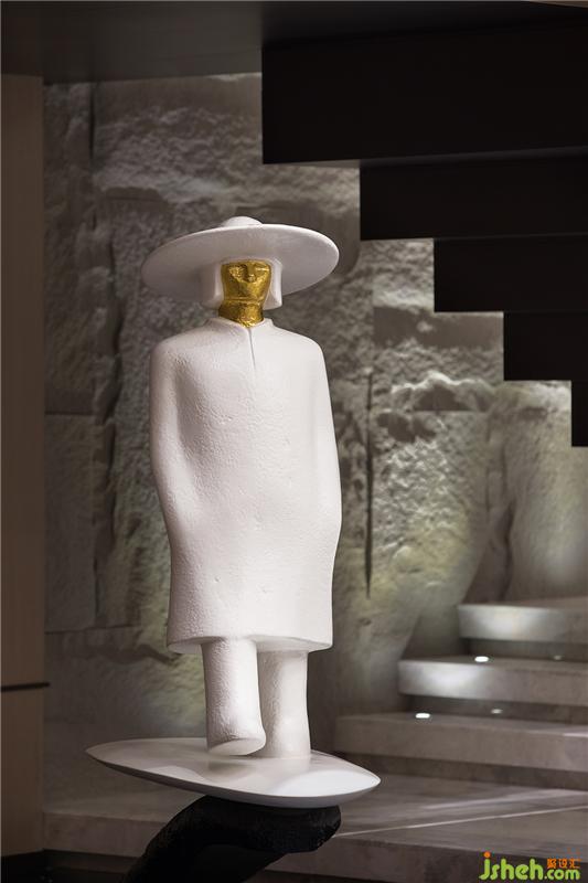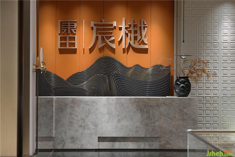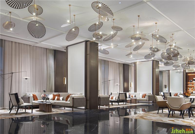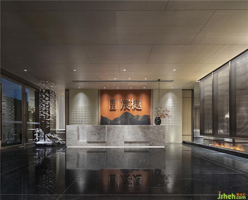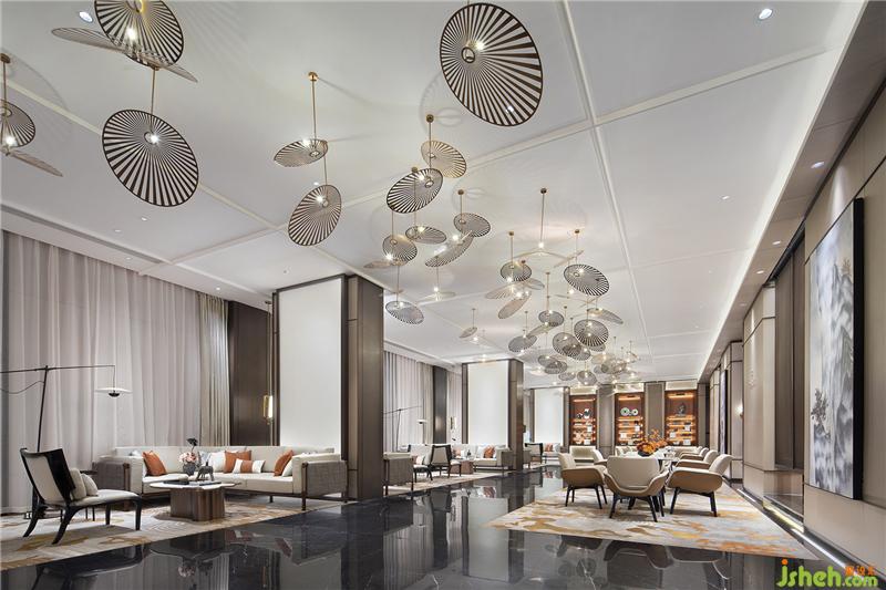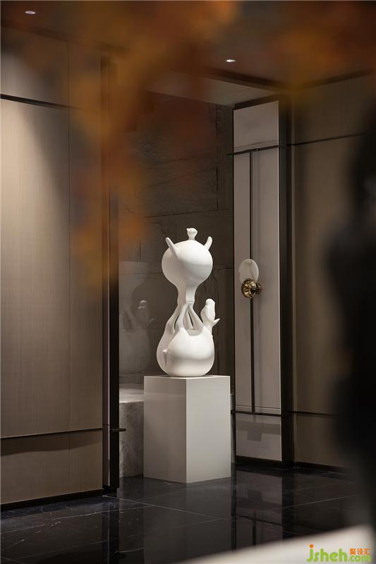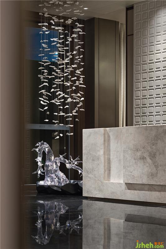 接待厅在浓郁的深境中辟出一丝轻盈之气,星星点点的艺术装置如礁石掷入江低,激起层层涟漪,飘飘然般的朦胧感模糊了室内外的界限。