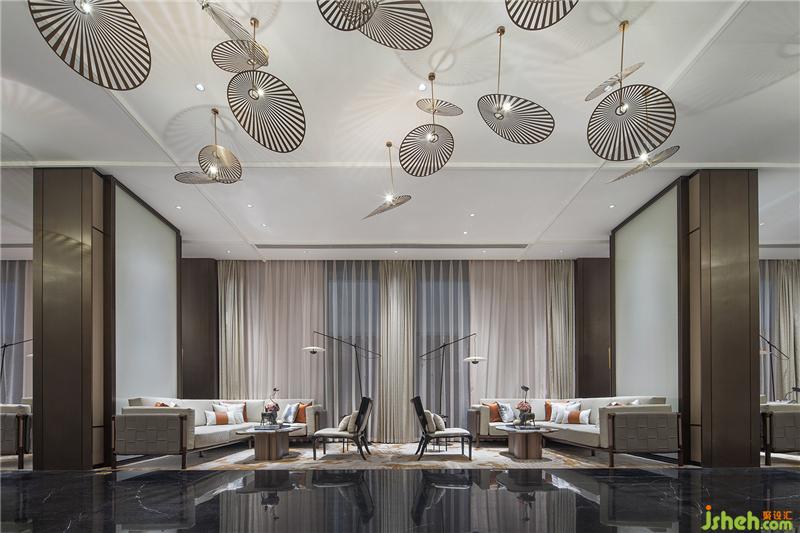 设计以一种「喧嚣表像,内隐闲情」的方式对话空间与人,只余经美过滤后的本质——典雅、舒适。景有浮翠星荷,扇里麦香,设计观物取象,嵌入芭蕉扇与精美纹路的灯饰,形成精巧的时尚气息,传达出一种令人愿意亲近且感到愉悦的氛围。