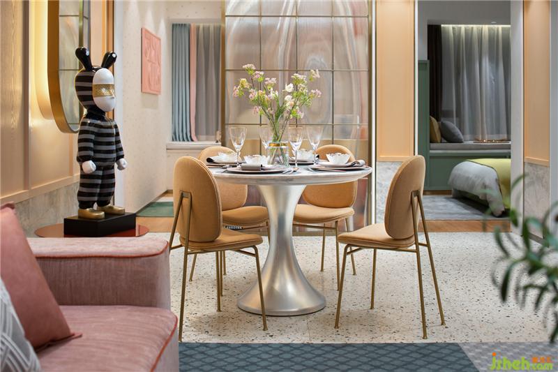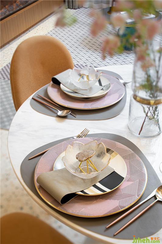 材质说明|水磨石、雅铂白石材、仿鱼肚白岩板、有色混水漆、金色拉丝不锈钢、艺术玻璃、墙纸