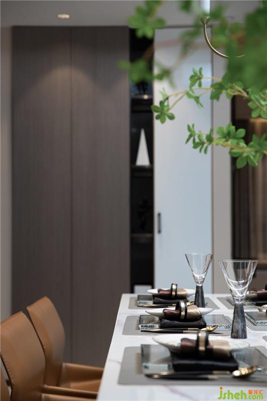 餐厅立于沙发后方,设计悉心于长型的餐桌而带来的开阔感,创造舒适合理的用餐区域。胡桃色墙面设立酒柜兼具收纳功能,搭配线性灯,样板房设计为搁置其间的器皿投下一道重彩。在此,一杯红茶,一叠小菜就足以温暖这处空间。