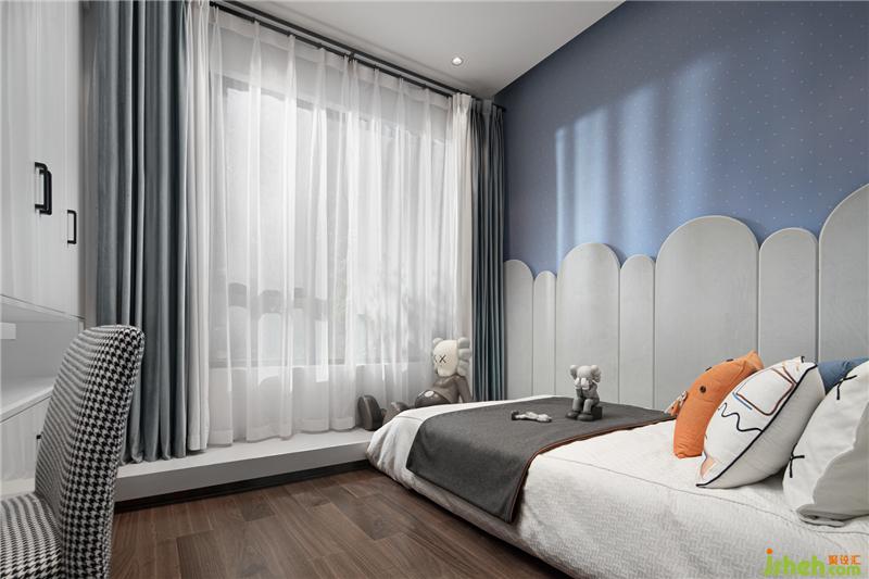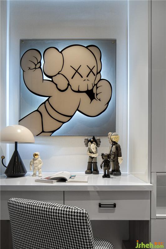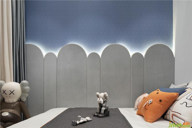 为了给孩子们提供一处充满童趣的空间,我们挑选了KAWS公仔以及云形趣味的背景墙造型空间,样板房设计舒适的配色创造一处安稳的睡寝氛围。