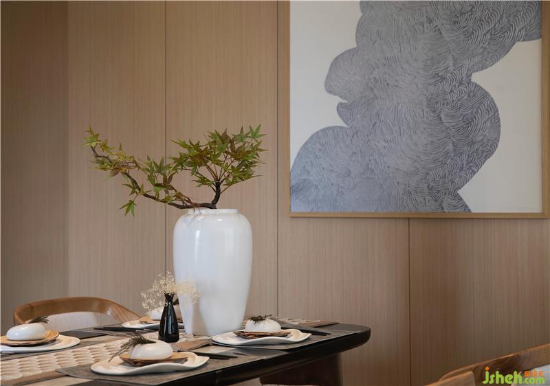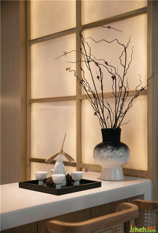光,衬着景,好似为空间蒙上了一层滤镜,在风的撩拨下,更显居所的温润与澄静。草色地毯平添空间的暖意,虽少了些耀眼的纹理,却与整体相得益彰。棉麻的座椅、瓷具的风姿,以及角落一隅的枯山水端景,物件的挑选都贯注着一致的轻松诗意,细微之下,静静诉说着禅式意境。