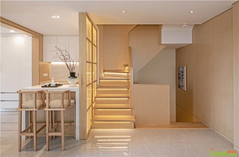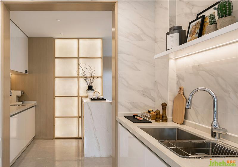 生活至上的乐趣,即便是只有两个人的晚餐,用餐也要平凡不乏情调。楼梯旁的空间角落,室内设计师将其改为中西厨结构,最大化划分一层功能,当暖光透过亚克力隔断融化在空间时,虽然浊茫如雾,此刻,却也美好恬淡。