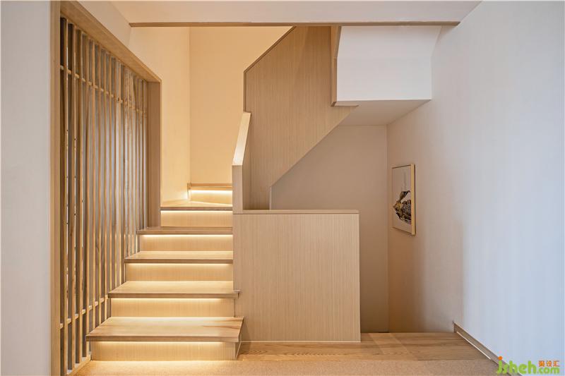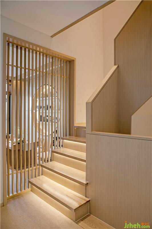楼道干净清雅,脚下的灯光散着妙不可言的姿态,踏步,行至二楼,透过木格栅隔断,隐约能看见里面的茶室,似透非透的结构更能让人心生想象,叫人挪不开眼。