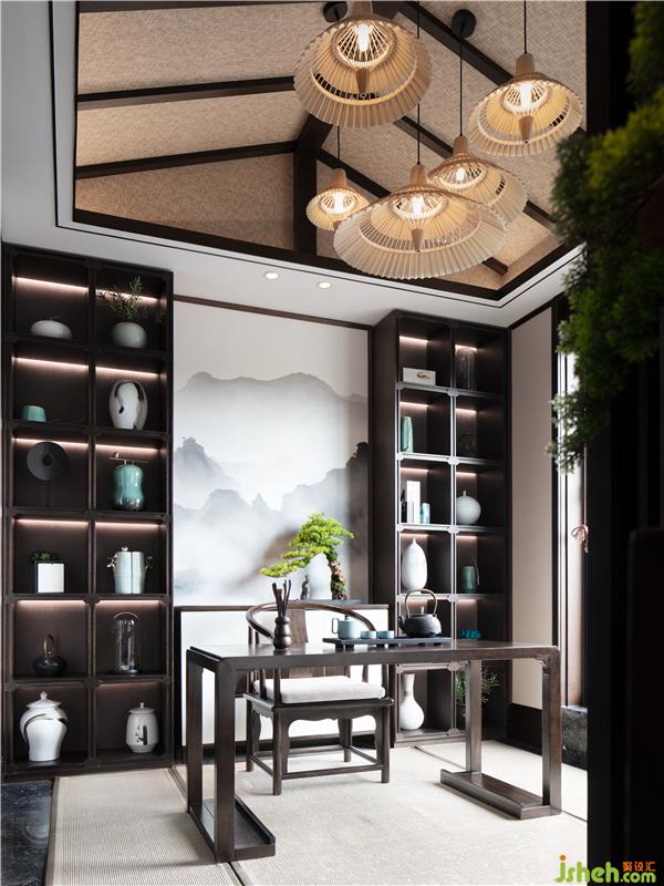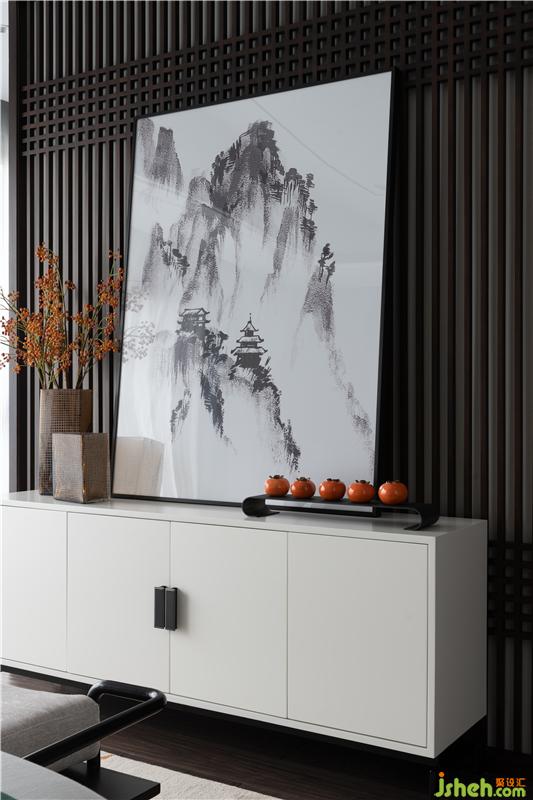 硬装布局以非常精确的比例关系来描绘生活态度至上,开放式餐厅与茶席,也瞬间拉近了心理上的距离,传统的中式餐桌椅,搭配饱含东方韵味的圆形水墨画,以及棉麻的桌垫与盆景茶具,人文墨客推杯换盏的隐居生活画面,悠然而惬意!
