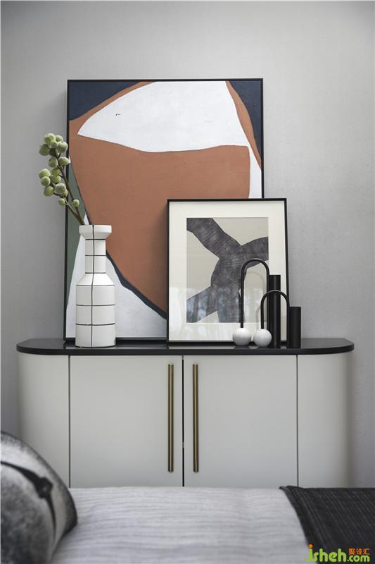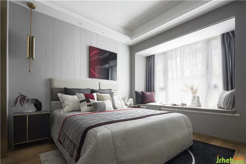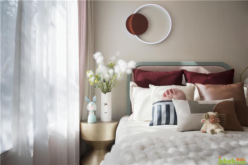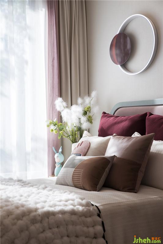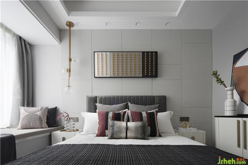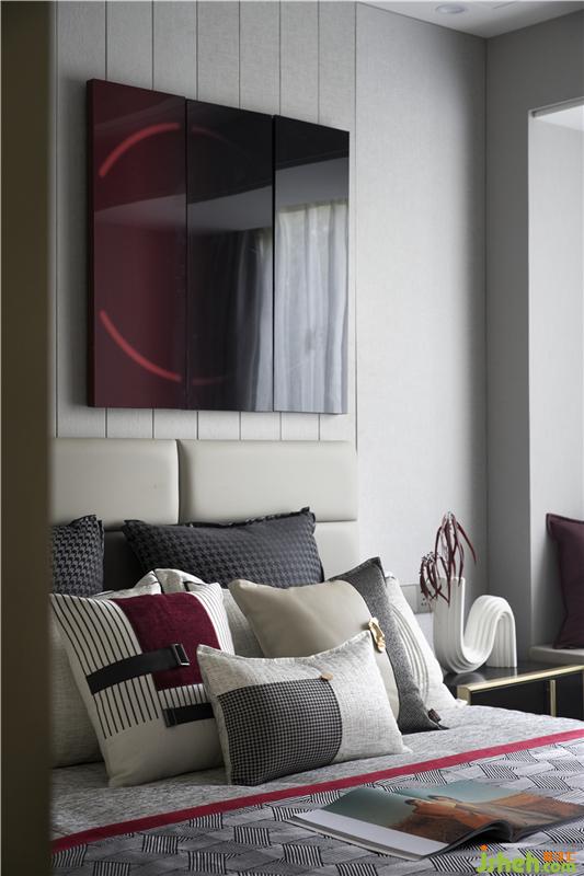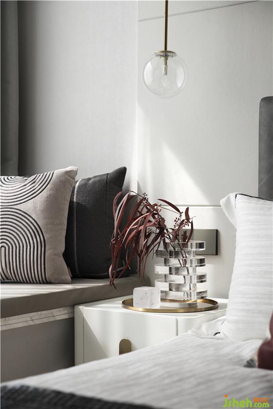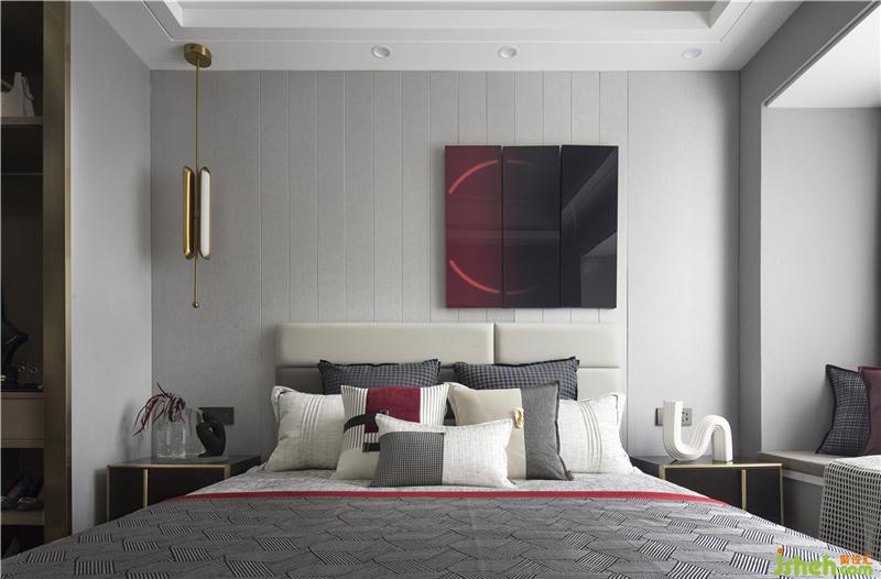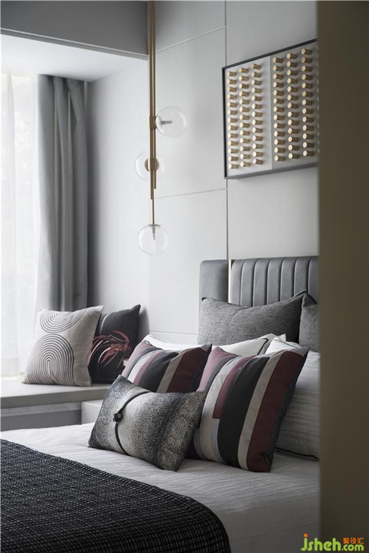 美的饰物的点缀,带着恰到好处的惊喜,垂落的吊灯以玻璃的剔透质感尽显优雅,床头的方形装饰带着几许摩登气息,稳重中不失意趣。