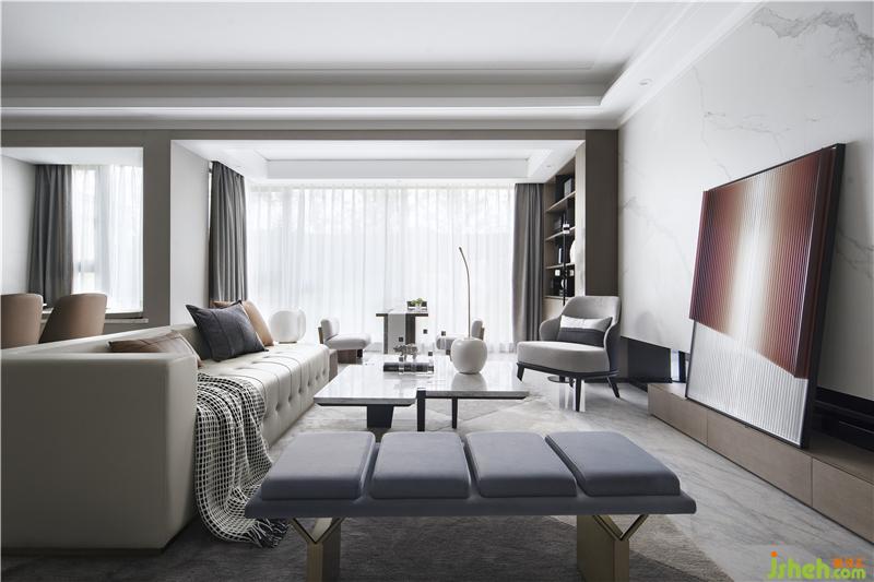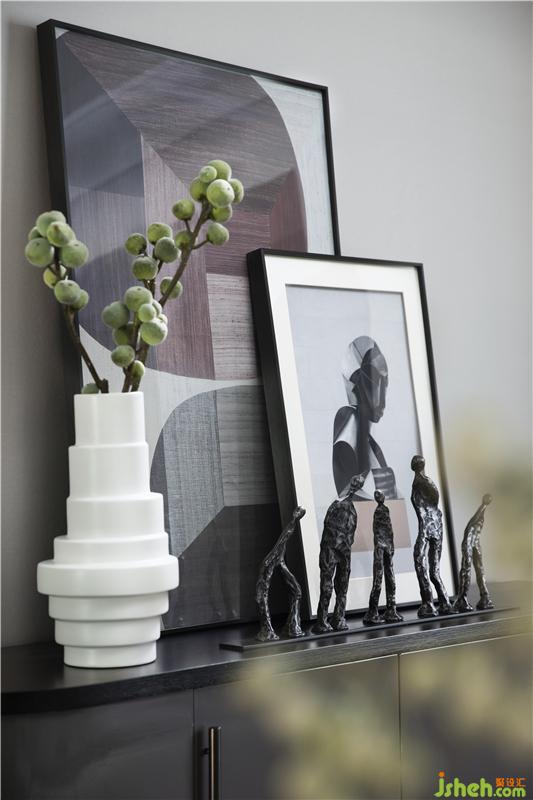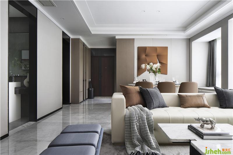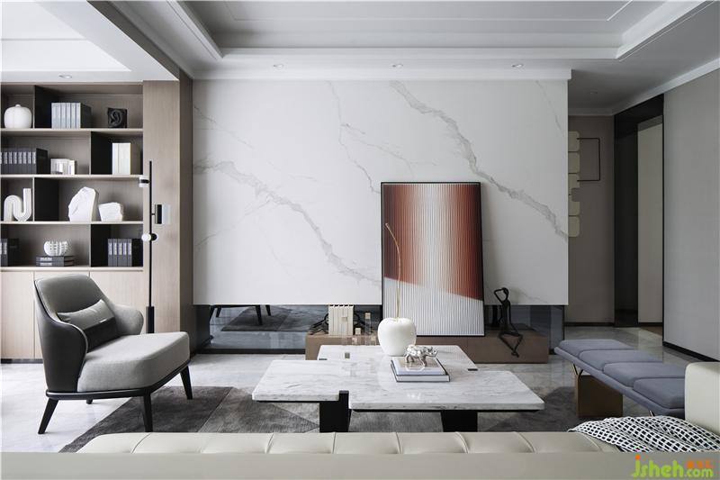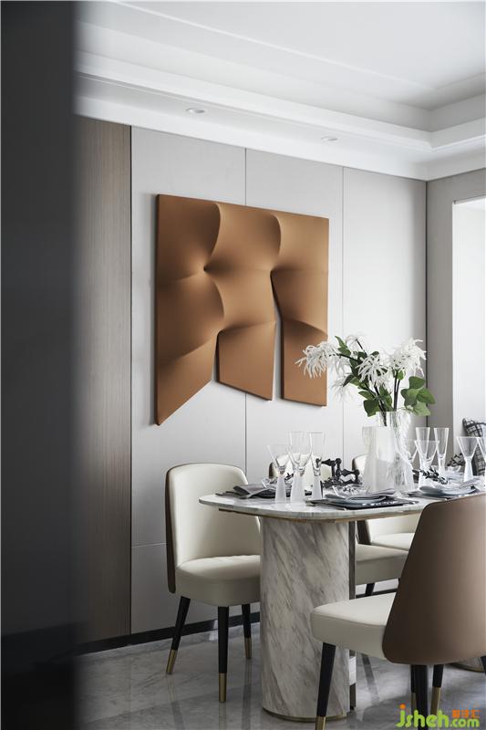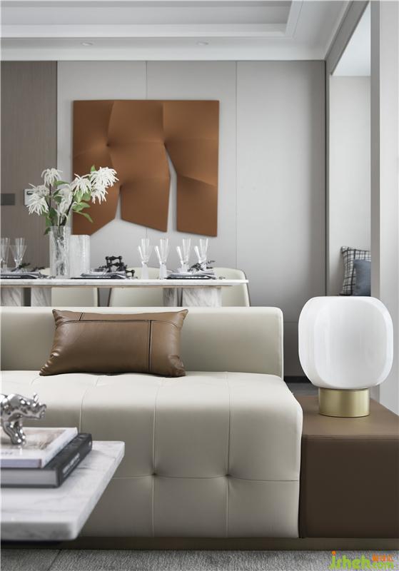 铅白、饴色、黑茶营造色彩与器具间的相生共构,沙发与大理石墙面的组合,略带一丝港式轻奢的格调,柔和不乏雅致的高级感,倚着墙面靠立的红白装饰画,线条简而有力,切割出设计对空间满而不溢的把控。