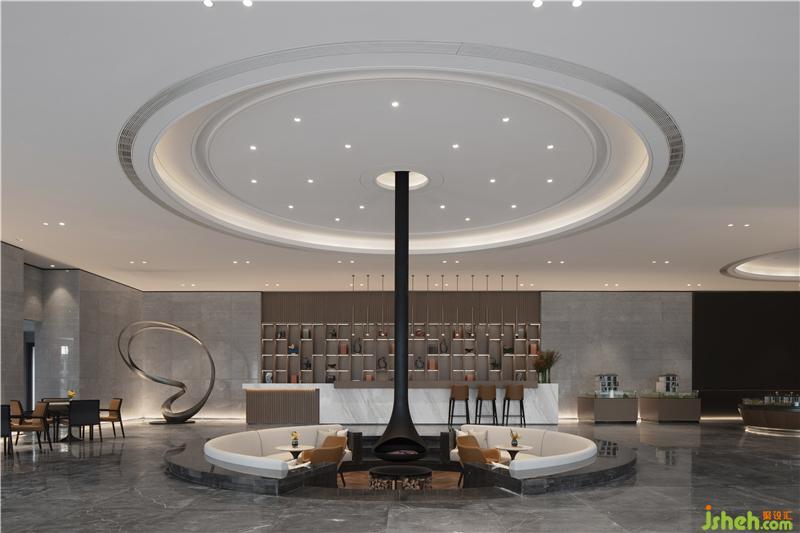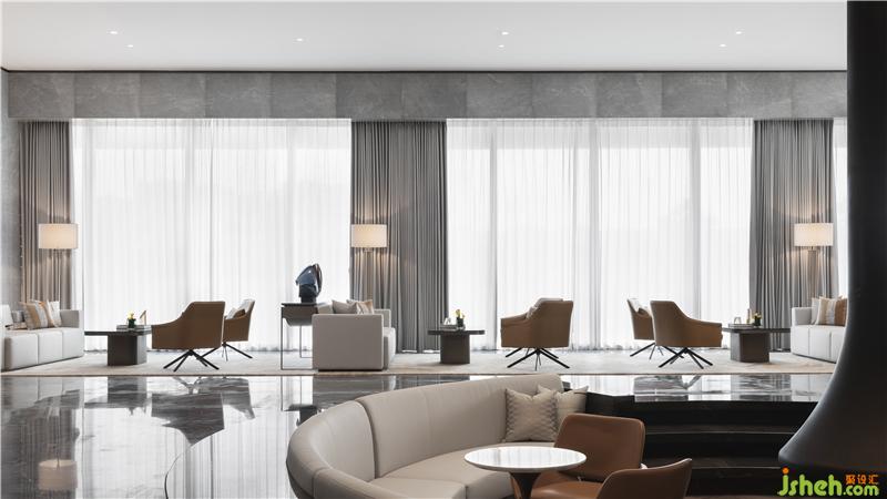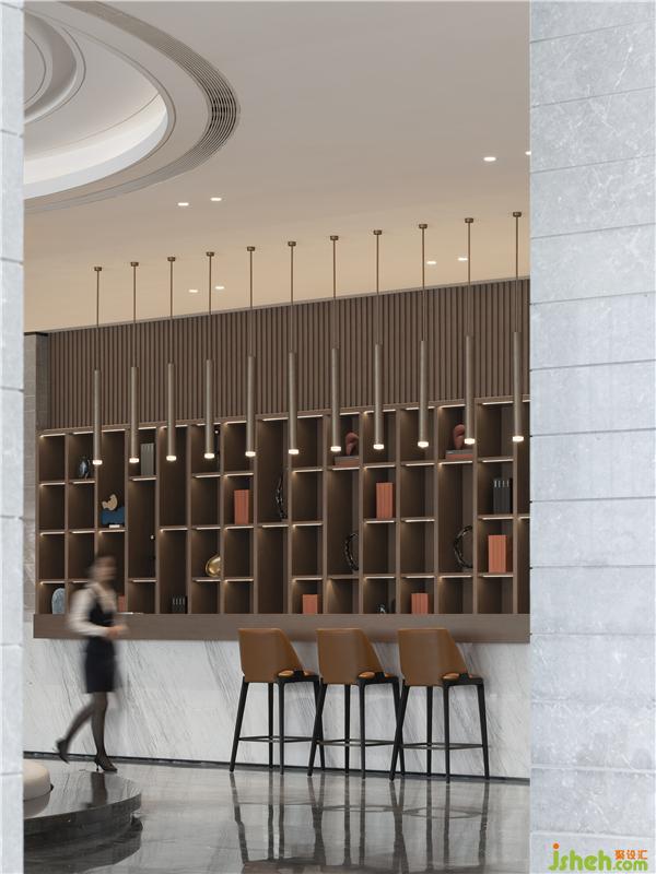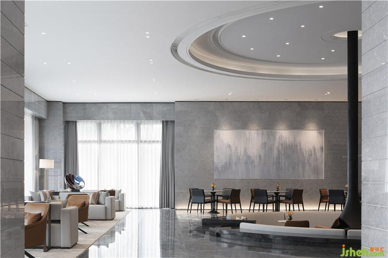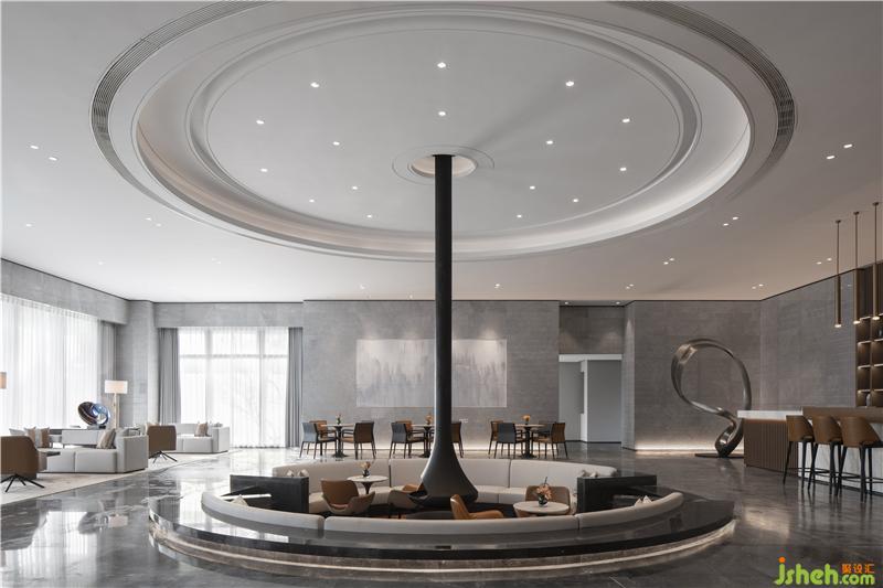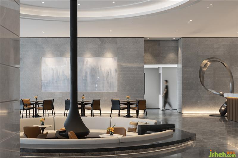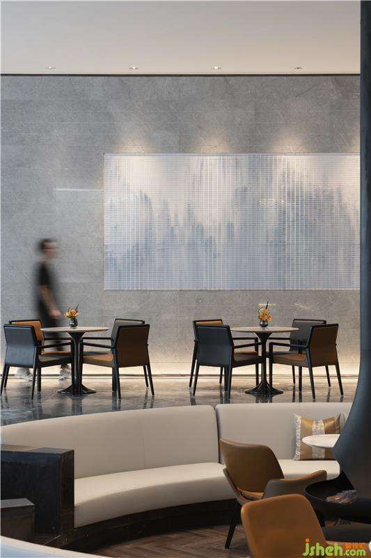步入下沉式洽谈区,空间交错起伏随光影变幻,