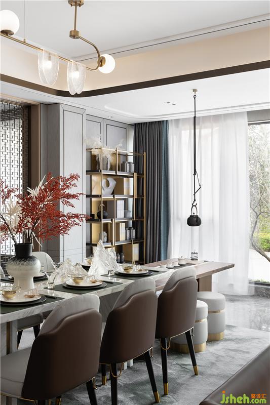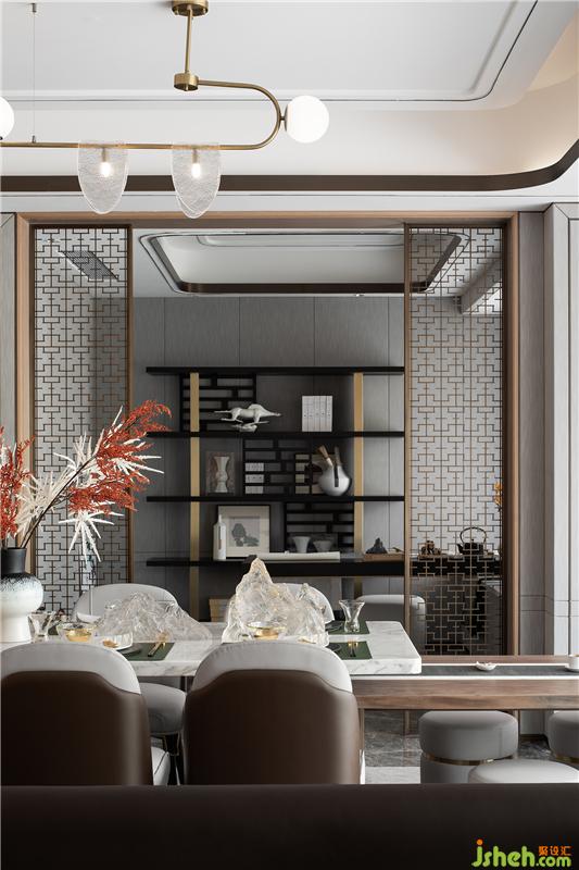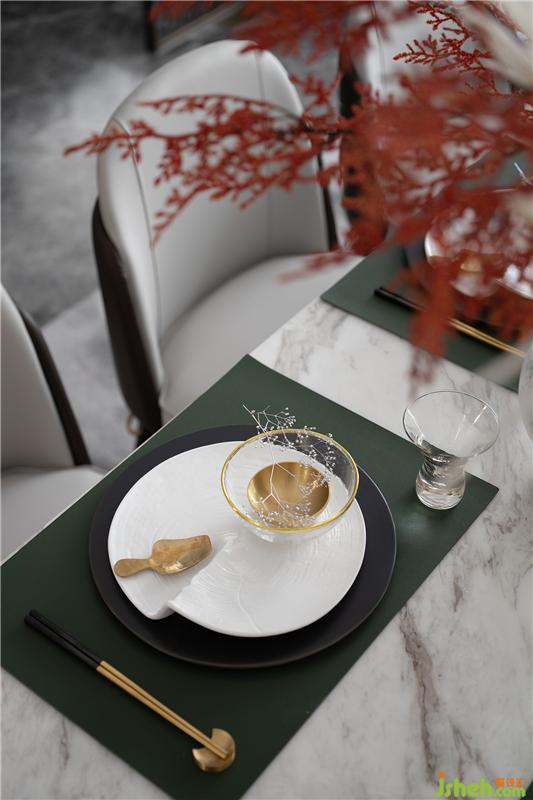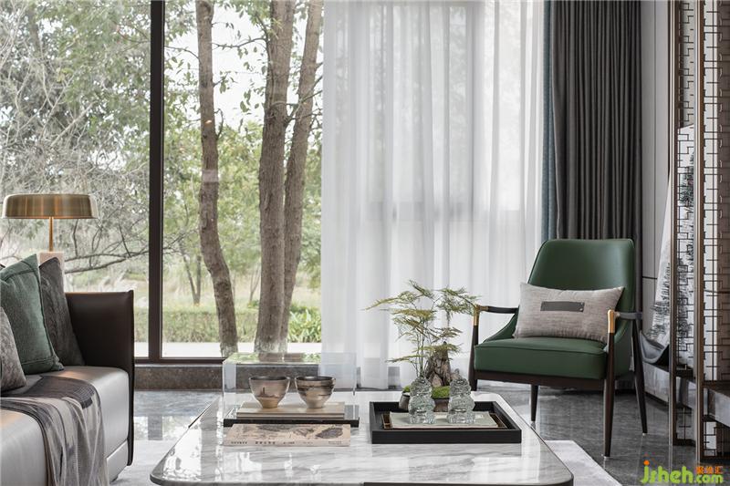 空间样板房设计以干净的黑白灰为大基调,以铜绿色点缀