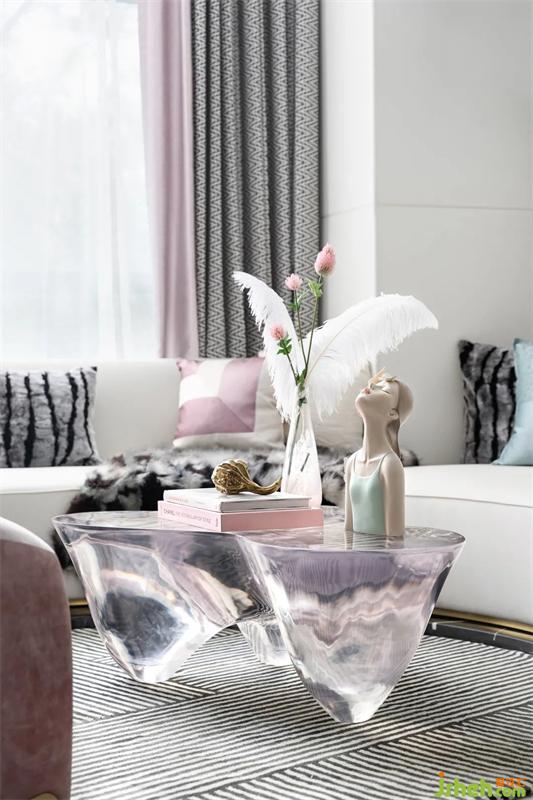 那盏垂在空中的灯饰散着柔和气息,茶几水晶三角底座的设计别出心裁,轻幽而有灵气,添增想象与趣味的艺术语言。