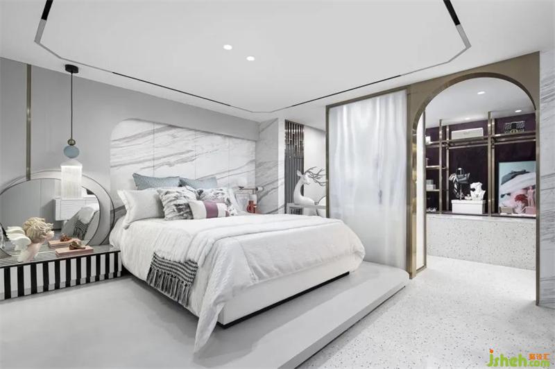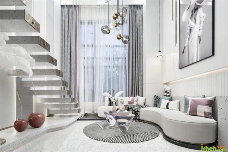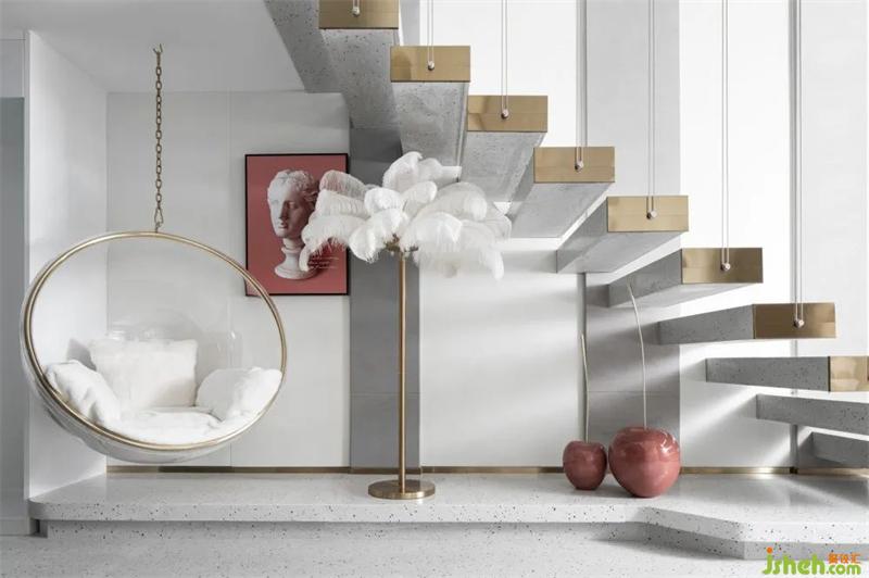 悬挂式的简约楼梯设计,是空间另一抹惊艳表述,金属与大理石的结合,让空间更显精致与穿透性。