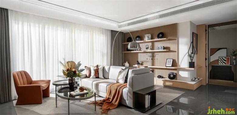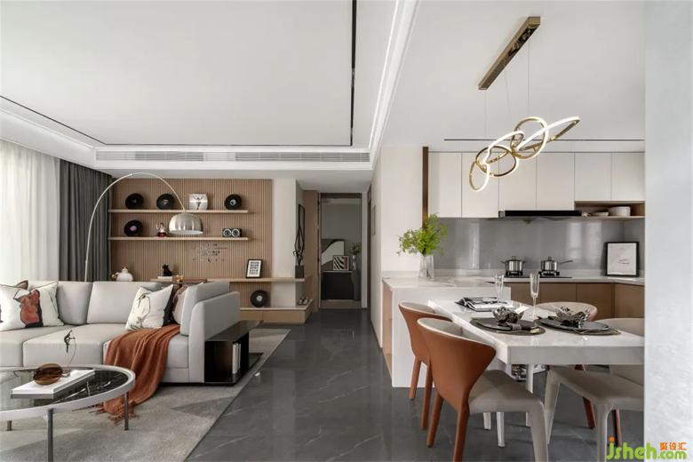 步入客厅,客、餐、厨、飘窗四区连通的LDKB一体化设计,在朗阔的空间尺度下,铺展着一场摩登都市的盛宴。将居者的艺术感知与审美品味,外化为对场景的解读。样板房设计这里不仅定义着优雅时尚的氛围意境,更有美学之外的真实生活。