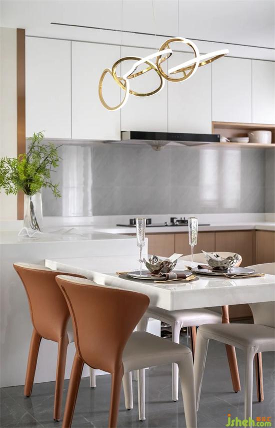 简静的理石白餐桌,与雅致的皮质棕餐椅,在极具当代气息的金属线型灯光的映照下,平衡着餐厅纯粹而高级的美学氛围。样板房设计与此同时,洒进室内阳光也如期而至,犹如一幅天然的背景画,为空间叙写着此间情境的美感。