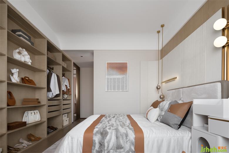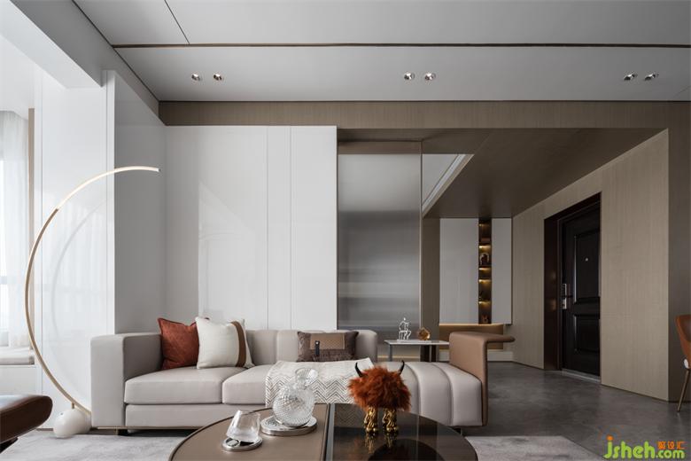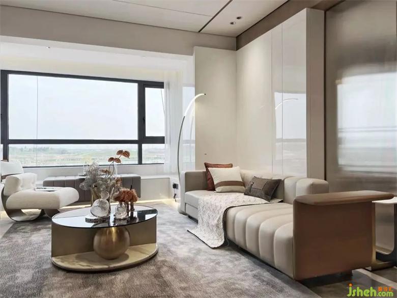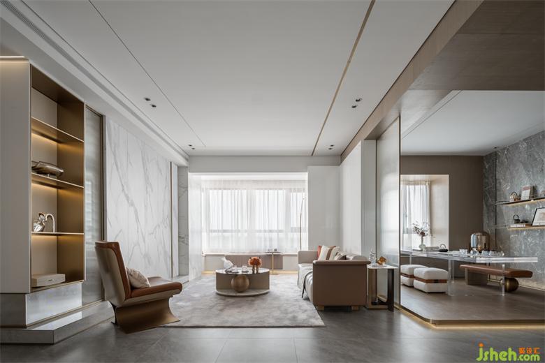 悬浮透明的茶几,为茶室增添了几分浪漫色彩,去贴合目标人群阅历世界之美后的静谧安然。样板房设计设计于人的体验,同样是有颜色、有声音、有味道,唤起内在的精神共鸣。单是风格色彩,就结合了意式的简约、宋式的简省,透射出奢华的浅色、淡雅的白。