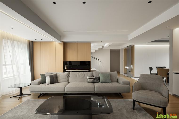 别墅设计以生活习惯定制洄游动线,向景而居,空间交互,从连接餐厅和厨房的早餐日光室到客厅,从围合的沙发到一层楼梯边的钢琴,开放空间的各个角落都功能明确但又可以视线相连。